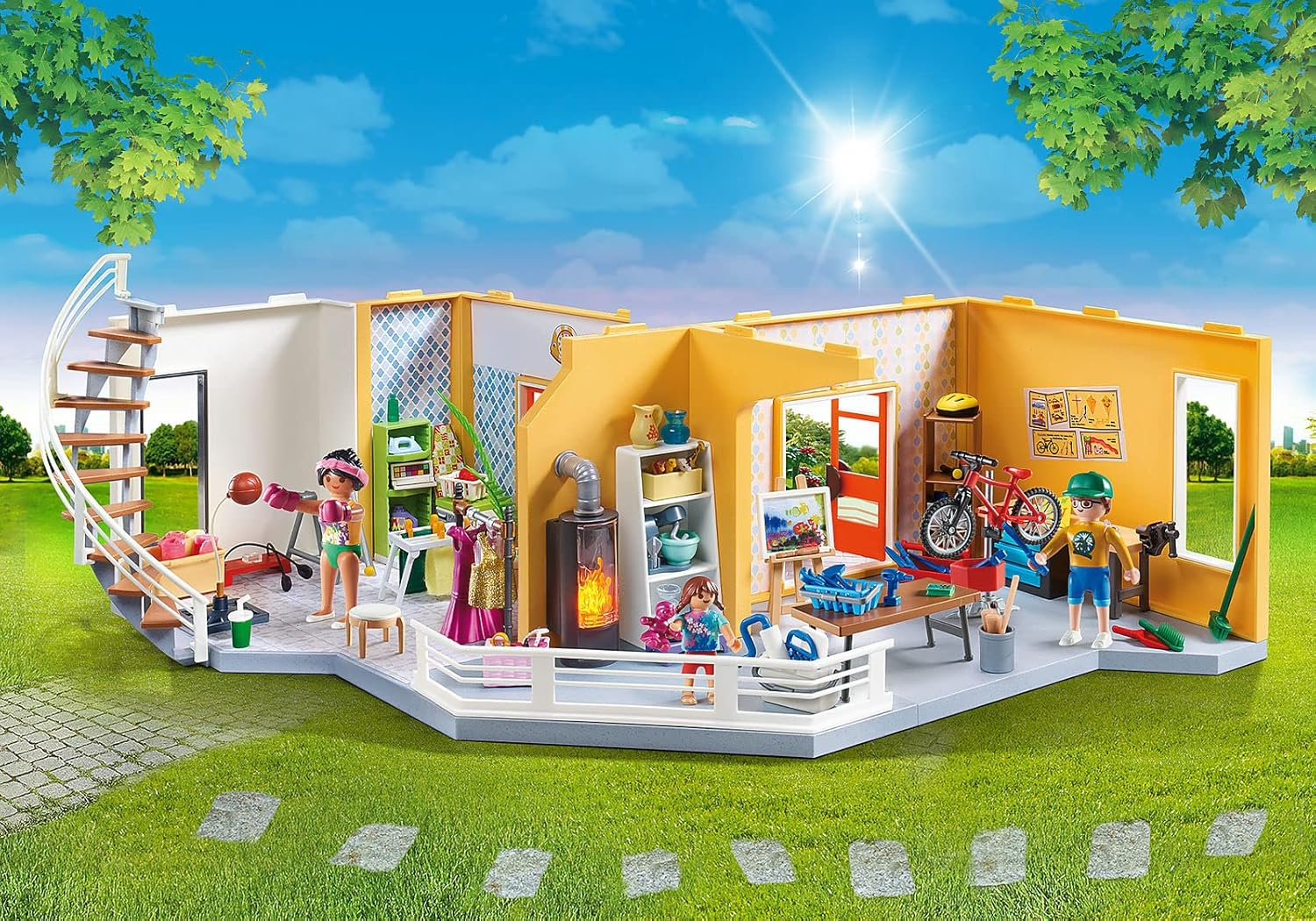 Wprowadź więcej życia do nowoczesnego domu dzięki rozszerzeniu podłogi. Znajdziesz tu mnóstwo miejsca na wszystkie swoje hobby. Trenuj w sali fitness na steperze i bokserskiej maszynie. Jeśli rower się zepsuje, można go sprawdzić i naprawić na stojaku montażowym. W sąsiednim pokoju rodzą się kreatywne pomysły, które są przenoszone na płótno przed migoczącym ogniem kominka. Nowoczesna pralka czeka, aby ułatwić rodzinie prace domowe. Dzięki dołączonym szablonom tapet pokoje w domu można udekorować według własnego uznania.