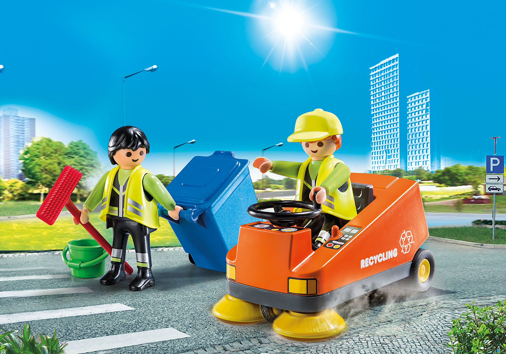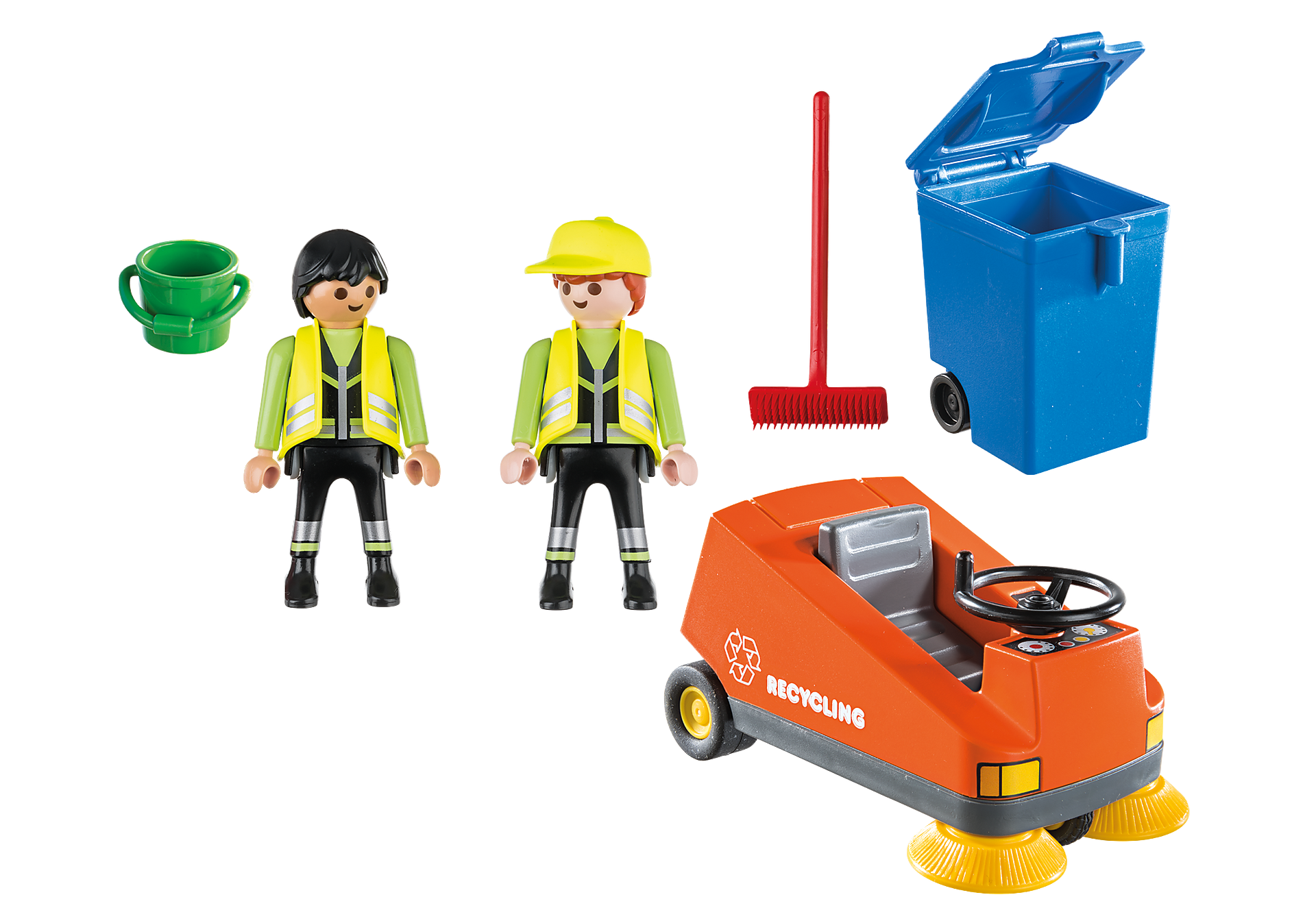 Playmobil sprzątanie miasta jest częścią serii City Life. W świecie Playmobil miasto jest zawsze czyste i zadbane. Wszystko to dzięki pomocy najlepszych fachowców, którzy posiadają najnowocześniejszy sprzęt. Zestaw zawiera 2 figurki Playmobil oraz zamiatarkę uliczną i kosz na śmieci. Zamiatarka posiada obracającą się szczotkę do zamiatania.