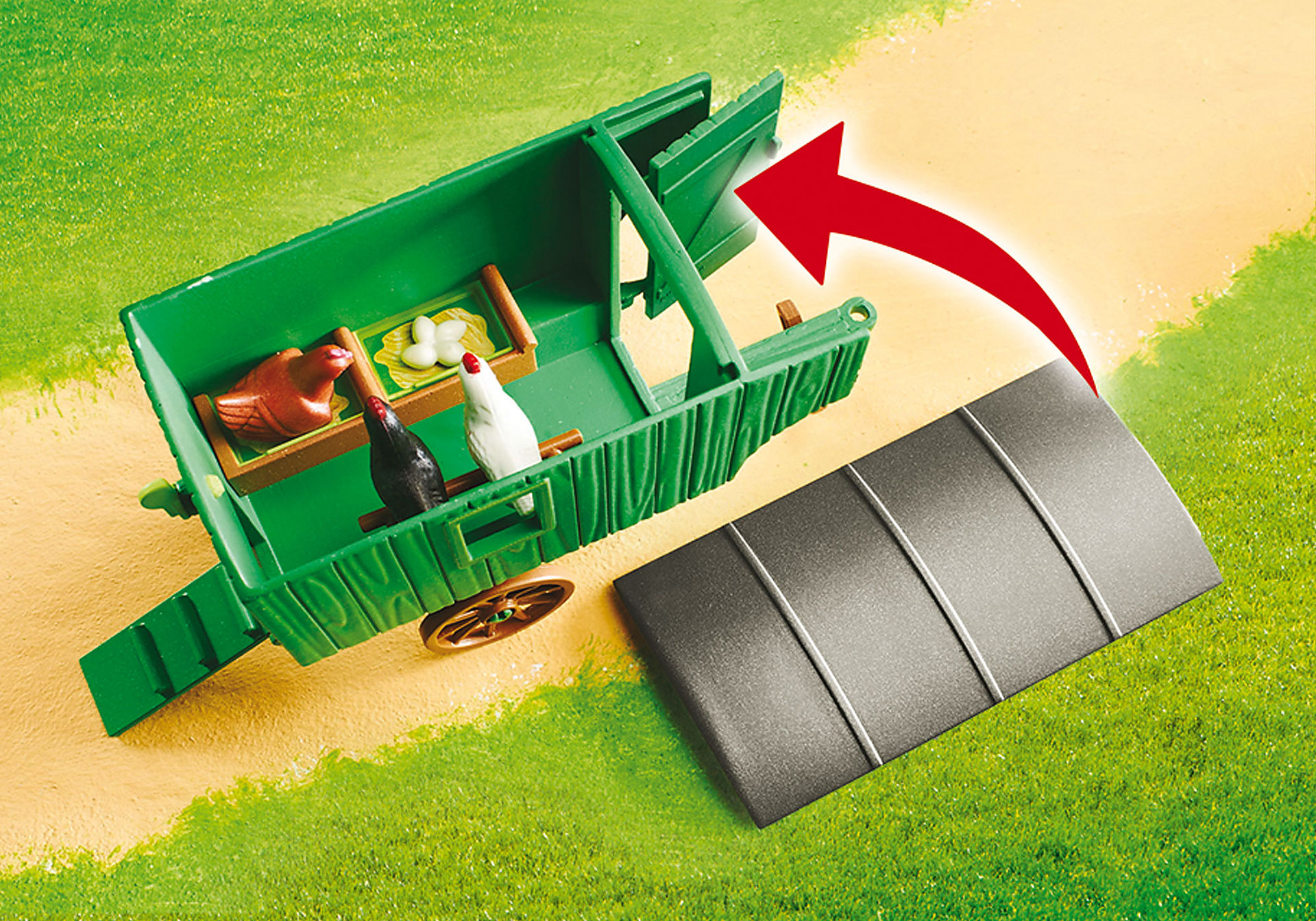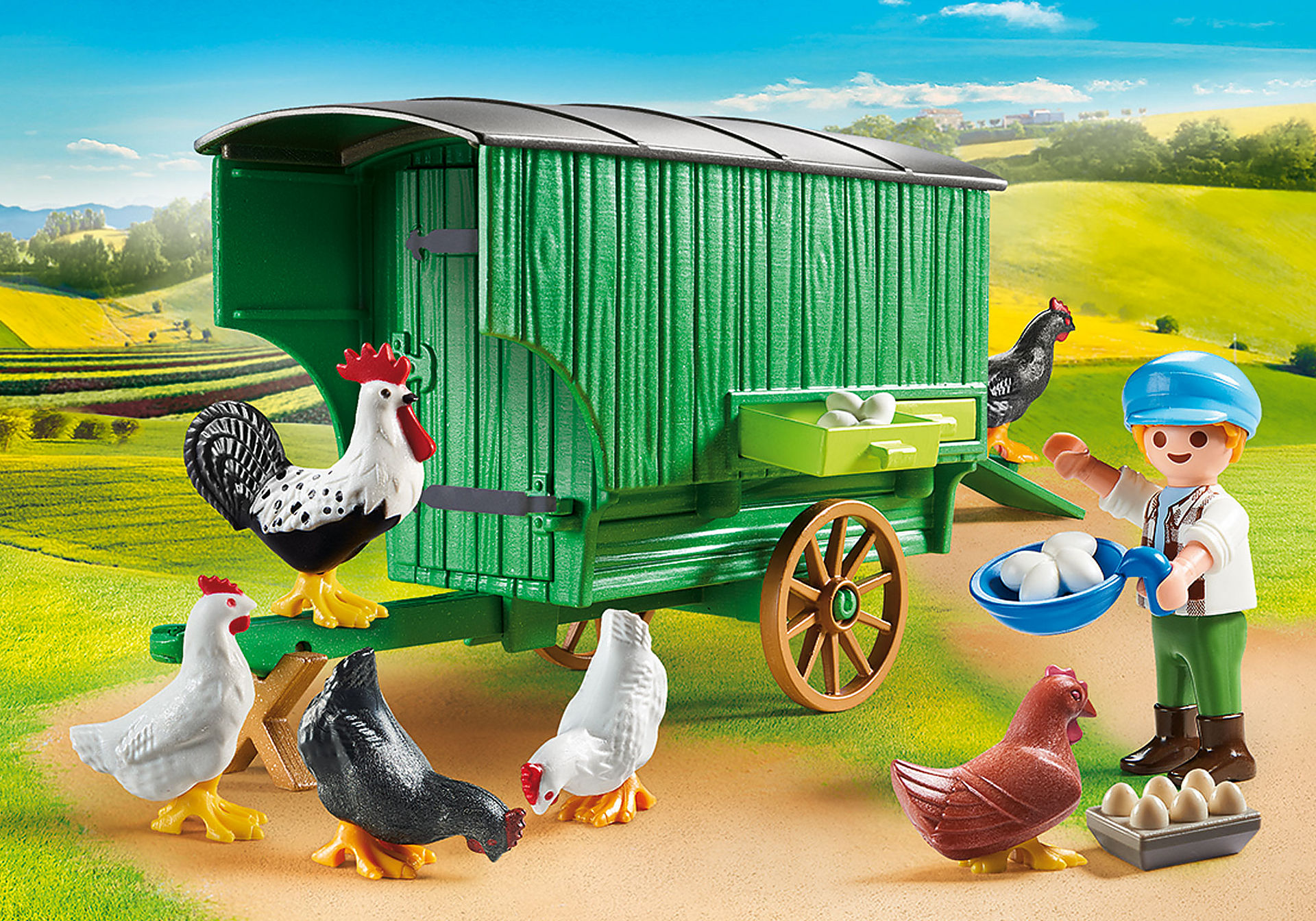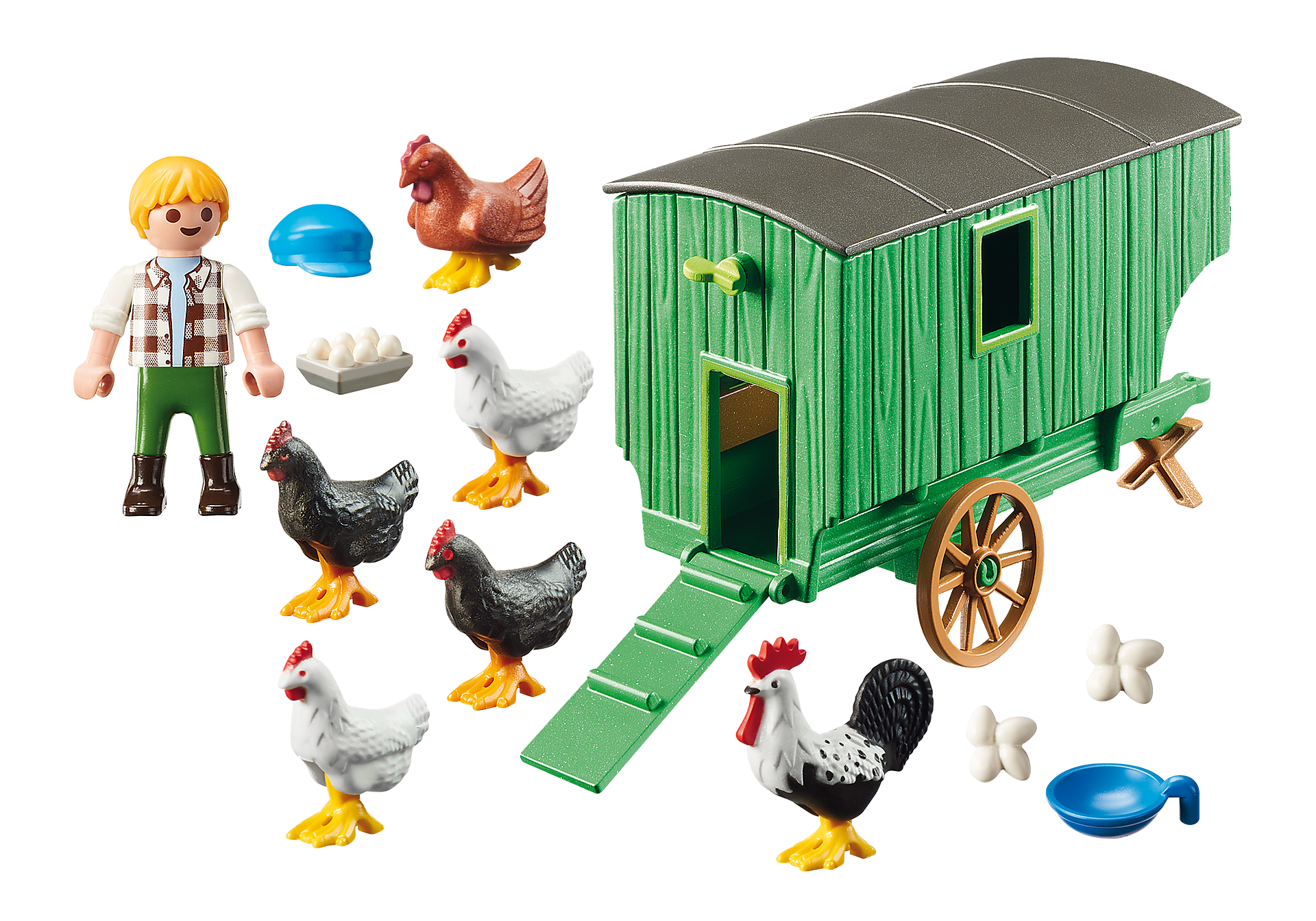 Zapraszamy do zakupu kurnika mobilnego! Kiedyś kurniki przyszłości, dziś stały się faktem. To najbardziej nowoczesne kurniki na świecie, a także olbrzymie ułatwienie dla hodowców drobiu. Kurniki mobilne, jako niezwiązane z gruntem nie wymagają zezwolenia na budowę. Kury bez stresu mogą znosić jajka, które można później wyjąć za pomocą szuflady znajdującej się w bocznej części mobilnego kurnika. Zestaw stanowi wspaniałe uzupełnienie serii gospodarstwo rolne. Dzieci mogą bawić się tym zestawem samodzielnie lub łączyć z innymi zestawami Playmobil, co daje możliwość tworzenia nowych wątków podczas zabawy.