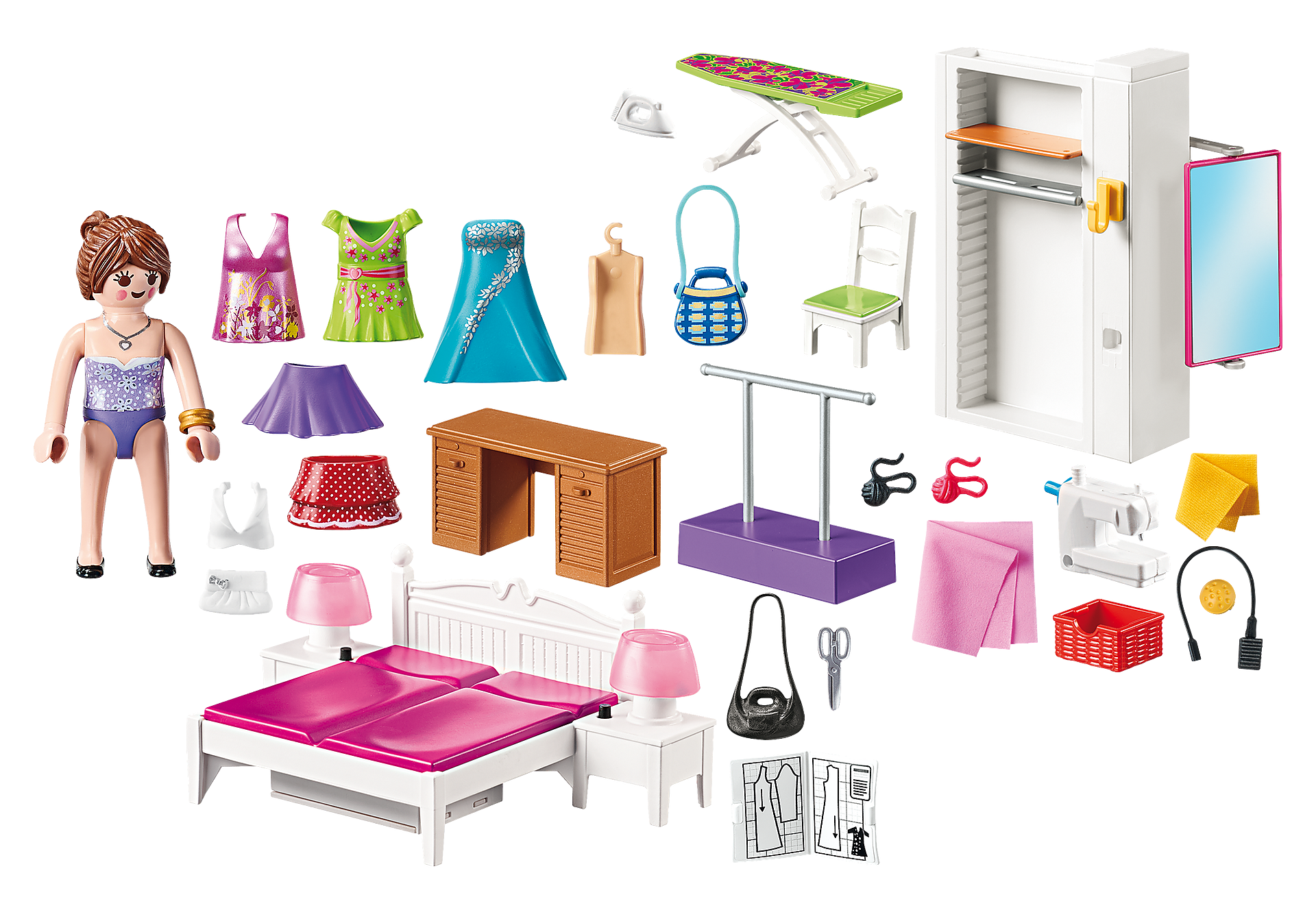 Połącz przyjemne z pożytecznym. W tym pomieszczeniu po skończonej twórczej pracy możesz udać się na zasłużony wypoczynek i sen. W sypialni został wydzielony kącik do pracy i odpoczynku. W kąciku do szycia znajduje się biurko z maszyną, deska do prasowania i żelazko, a na wieszakach wiszą gotowe sukienki, które są rezultatem pracy twórczej naszej projektantki mody. Po wyczerpującym i twórczym zajęciu nasza artystka może odpocząć w dużym pięknym łóżku, które wyposażone jest także w świecące lampki nocne. Sypialnia z kącikiem do szycia to wspaniały komplet, który może stać się uzupełnieniem do wyposażenia domku Playmobil. Zestaw stanowi wspaniałe uzupełnienie serii, ale świetnie nadaje się również do zabawy z pominięciem innych zestawów.