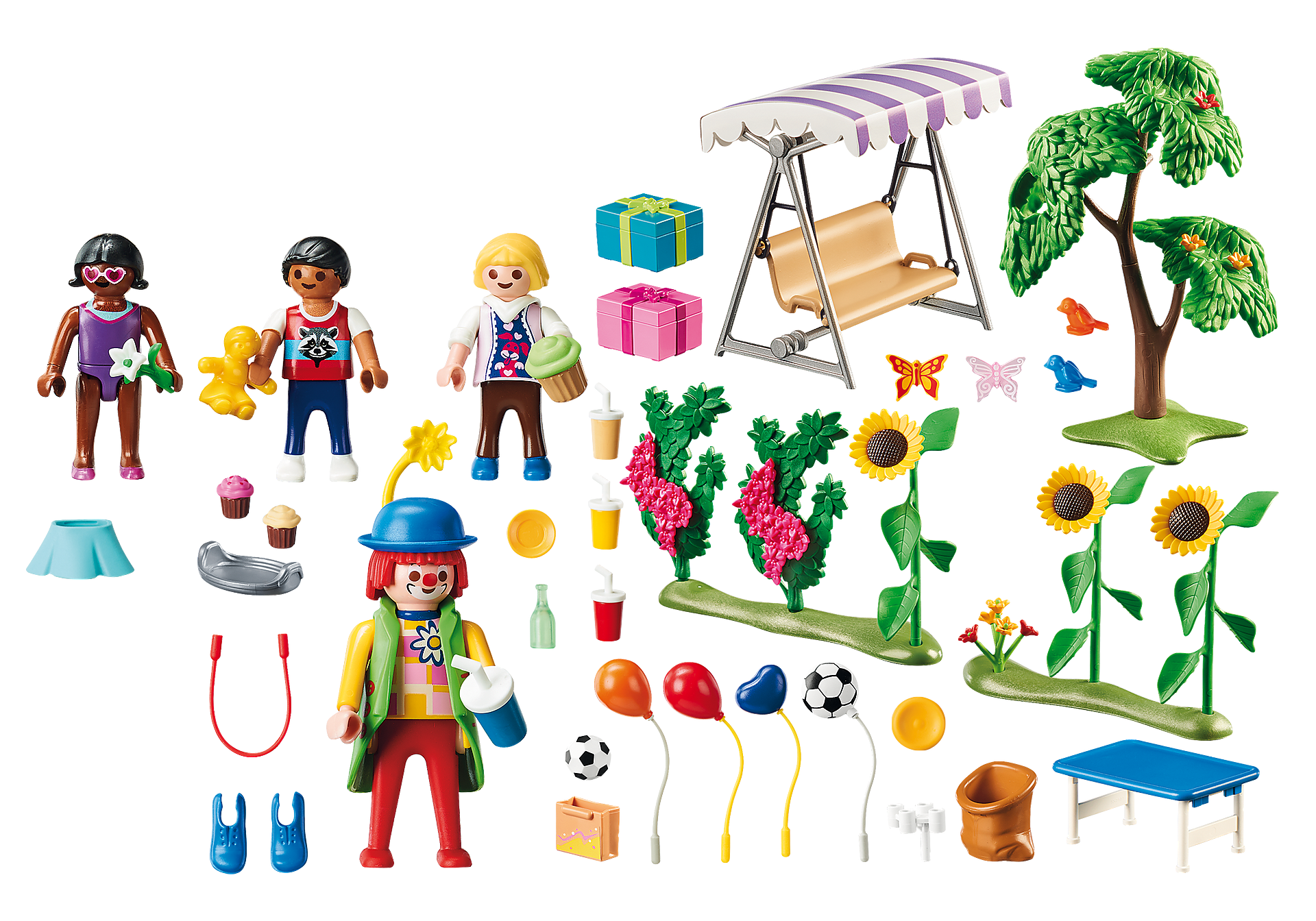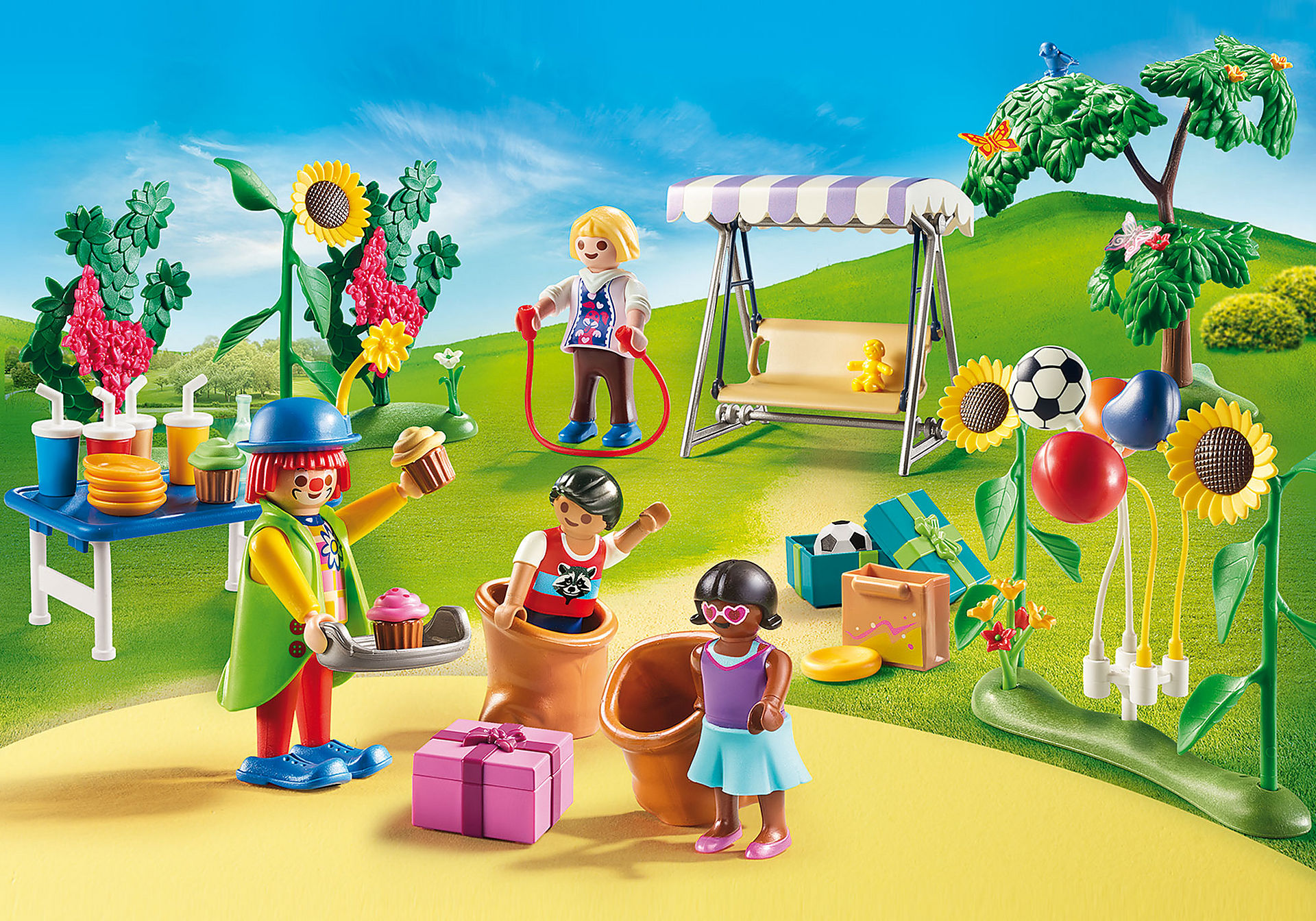 Urodziny w ogrodzie to wspaniały komplet, który może stać się uzupełnieniem do wyposażenia domku Playmobil. Wszystkie dzieci uwielbiają zabawy i imprezy na świeżym powietrzu. Rodzice postanowili wyprawić swoim pociecha wspaniałą imprezę urodzinową. Zatrudnili animatora, który przebrał się za klauna. Animator zorganizował dla dzieci różne gry i konkurencje. Nie zabrakło też słodkości, kolorowych napojów, różnorodnych balonów oraz prezentów. Zestaw stanowi wspaniałe uzupełnienie serii, ale świetnie nadaje się również do zabawy z pominięciem innych zestawów.