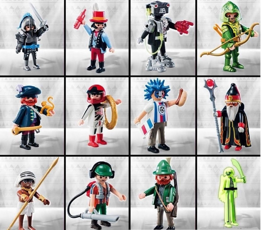 12 torebek – niespodzianek z figurami Playmobil. Figurki można rozkładać, dzięki czemu możemy złożyć unikatową figurkę.