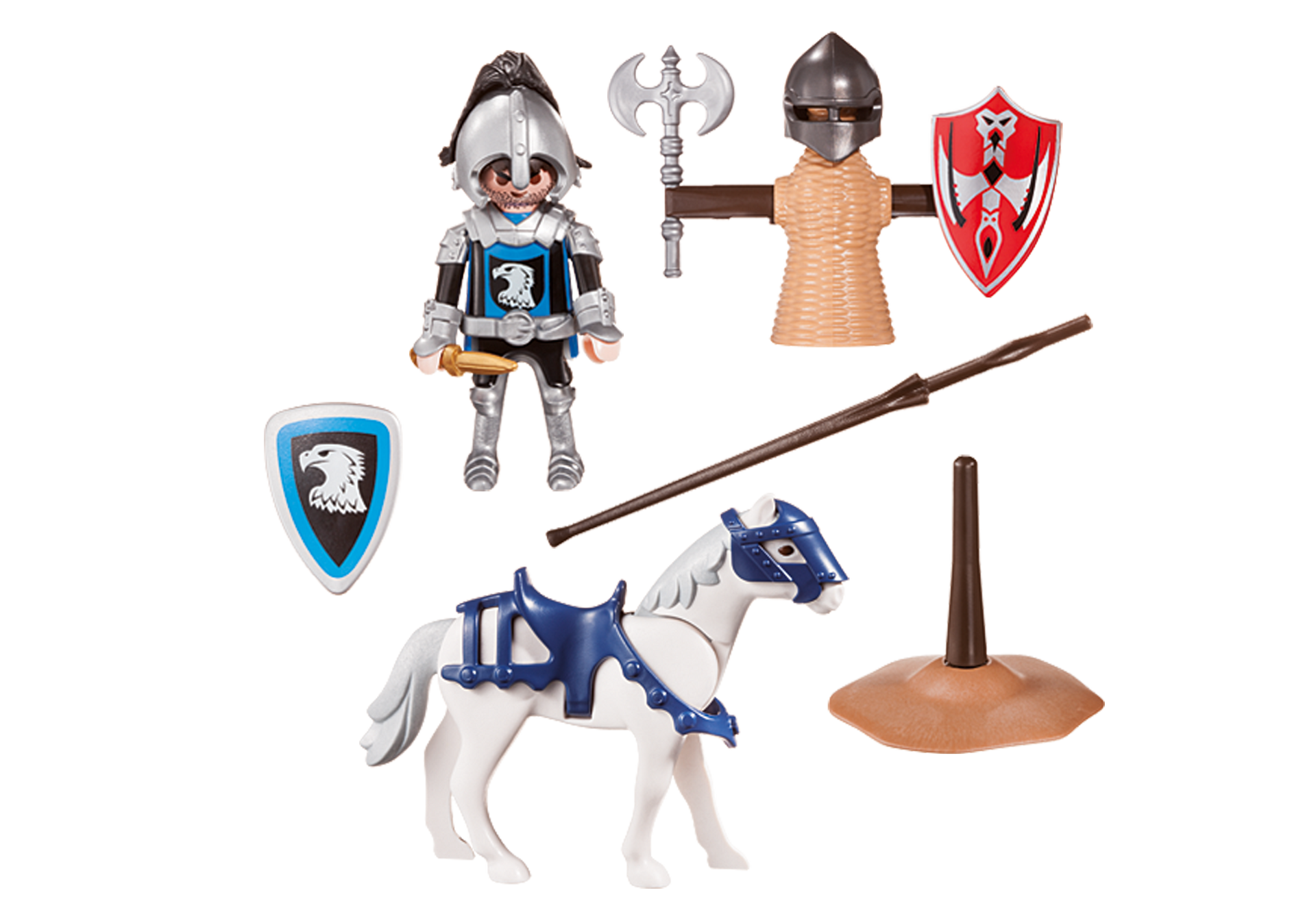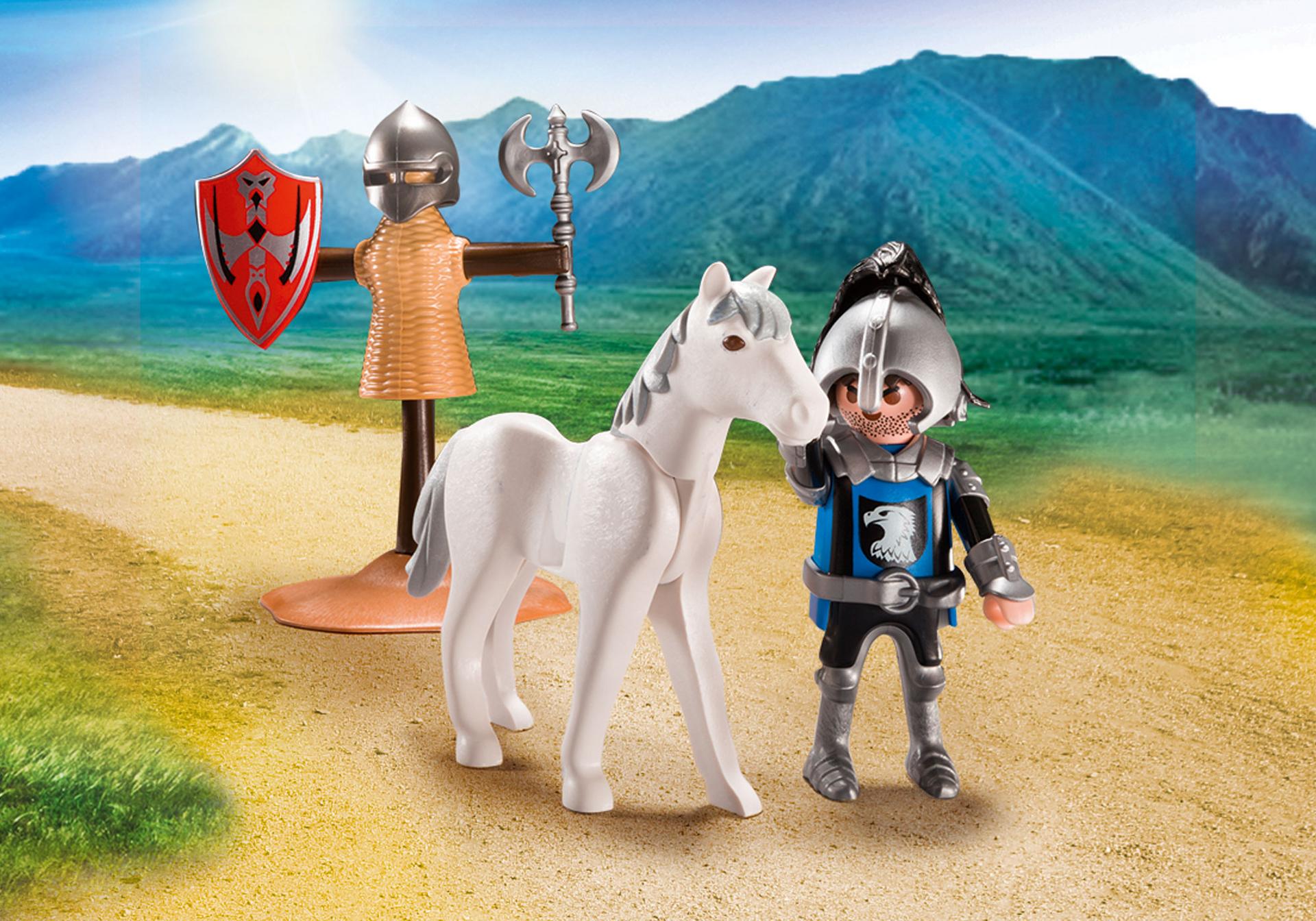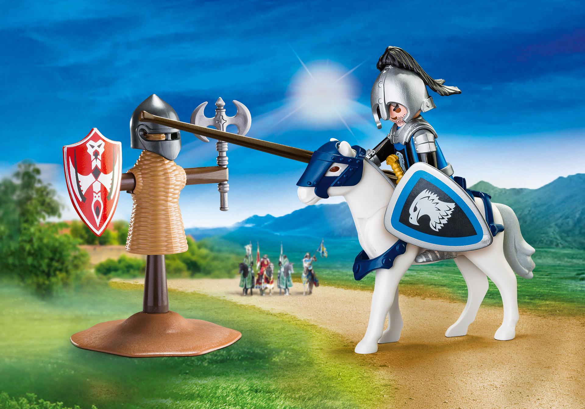 Zestaw stanowi wspaniałe uzupełnienie serii Rycerze Playmobil. Przenieś się w historyczne czasy i poczuj jak prawdziwy wojownik. W skład zestawu wchodzi figurka rycerza oraz kukiełka do ćwiczeń. Opakowanie zestawu stanowi wygodna skrzyneczka, do której schowamy klocki po skończonej zabawie.
