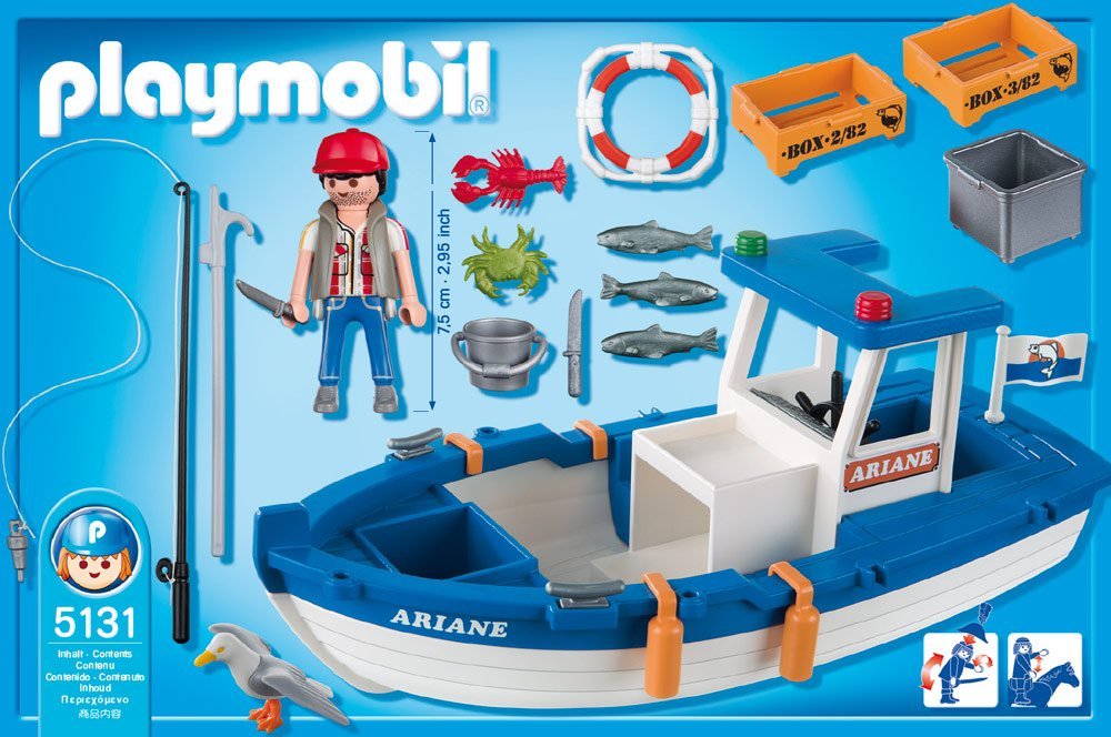 Playmobil Hotel to seria która zabierze Cię na niezapomniane wakacje. Nie ma nic lepszego niż leżenie na słonecznej plaży, skakanie przez morskie fale skuterem wodnym, czy zabawy w Aqua Parku. Dzieci mogą ruszyć również w fascynującą podróż kamperem, zwiedzać wyspy promem lub udać się na połów ryb kutrem rybackim. Kuter Rybacki Playmobil 5131 zwie się "Ariane". Na jego pokładzie znajdziemy, gotowy po połowu osprzęt rybacki. Wędkę, skrzynie na ryby, bosak, koło ratunkowe i nóż do obierania ryb. Zawartość zestawu uzupełniają figurka rybaka w kufajce, ryby, krab, homar i mewa. Kuter można również uzupełnić o podwodny silnik.