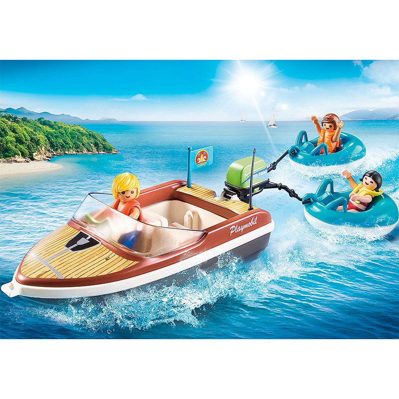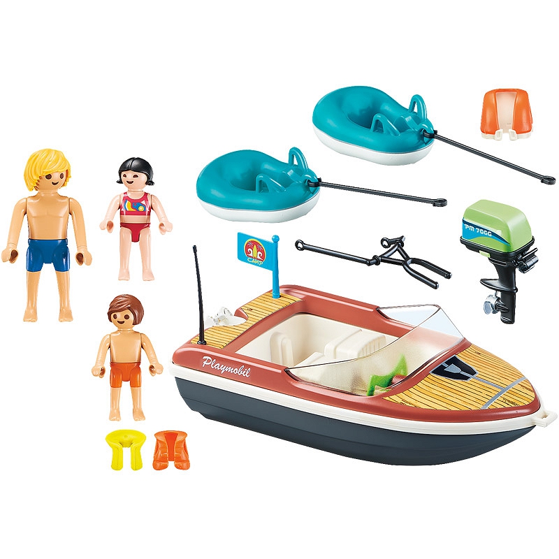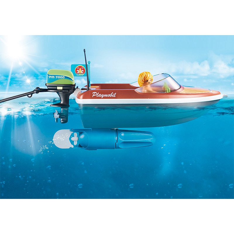 Łódź motorowa z pontonami 70091. Wyrusz na wspaniałą morską wyprawę wakacyjną motorówką. Istnieje możliwość automatycznego napędzania łodzi za pomocą silnika podwodnego Playmobil (sprzedawany oddzielnie). Ciesząc się morską bryzą i słońcem rozpocznij wakacyjną przygodę. Dzieci mogą bawić się tym zestawem samodzielnie lub łączyć z innymi zestawami Playmobil, co daje możliwość tworzenia nowych wątków podczas zabawy.
