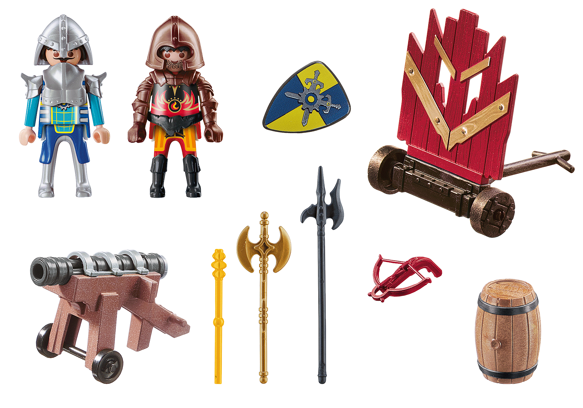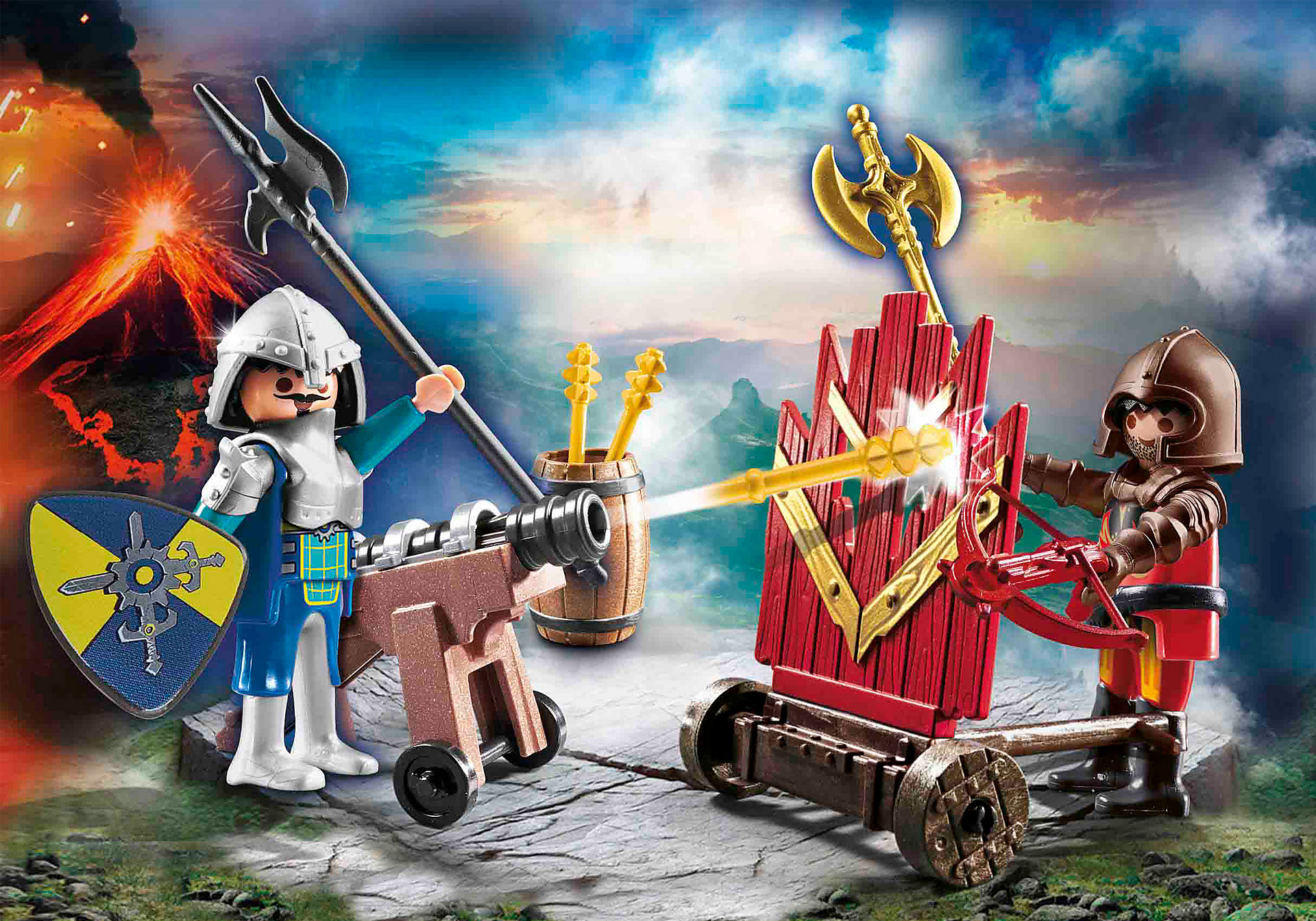 Ponury Burnham Raider atakuje. Jest schowany za swoją ruchomą tarczą ochronną, ale Rycerz Novelmore podejmuje walkę. Szybko oddaje swój pierwszy strzał z armaty. Uważaj na Burnham Raider! Zestaw zawiera dwie figurki, tarczę ochronną na kółkach, mobilne działo z pociskami bełtowymi, beczkę, kuszę, tarczę i inne dodatki. Dzięki odpowiednim do wieku akcesoriom, pakiety startowe są idealne dla dzieci od trzeciego roku życia.