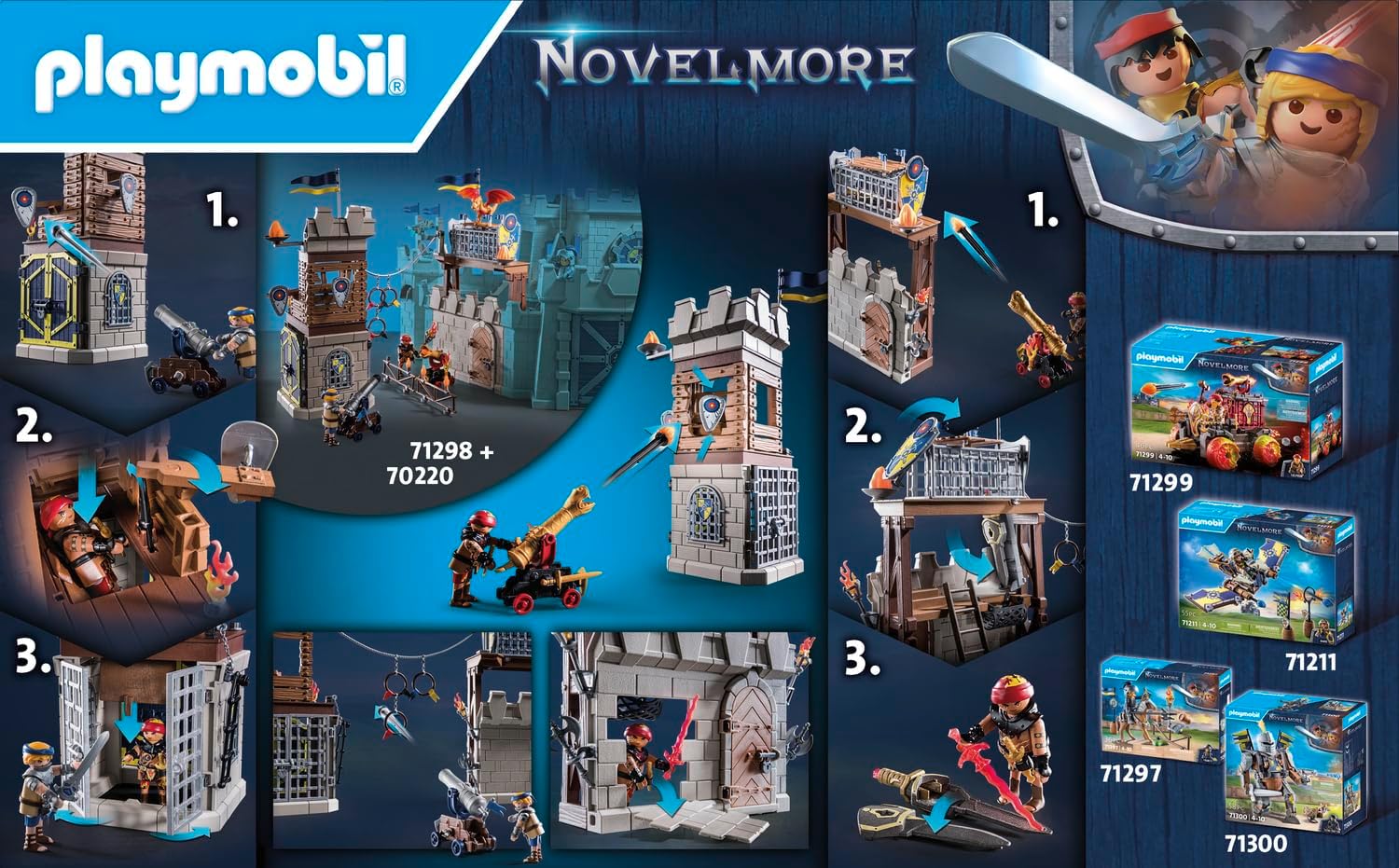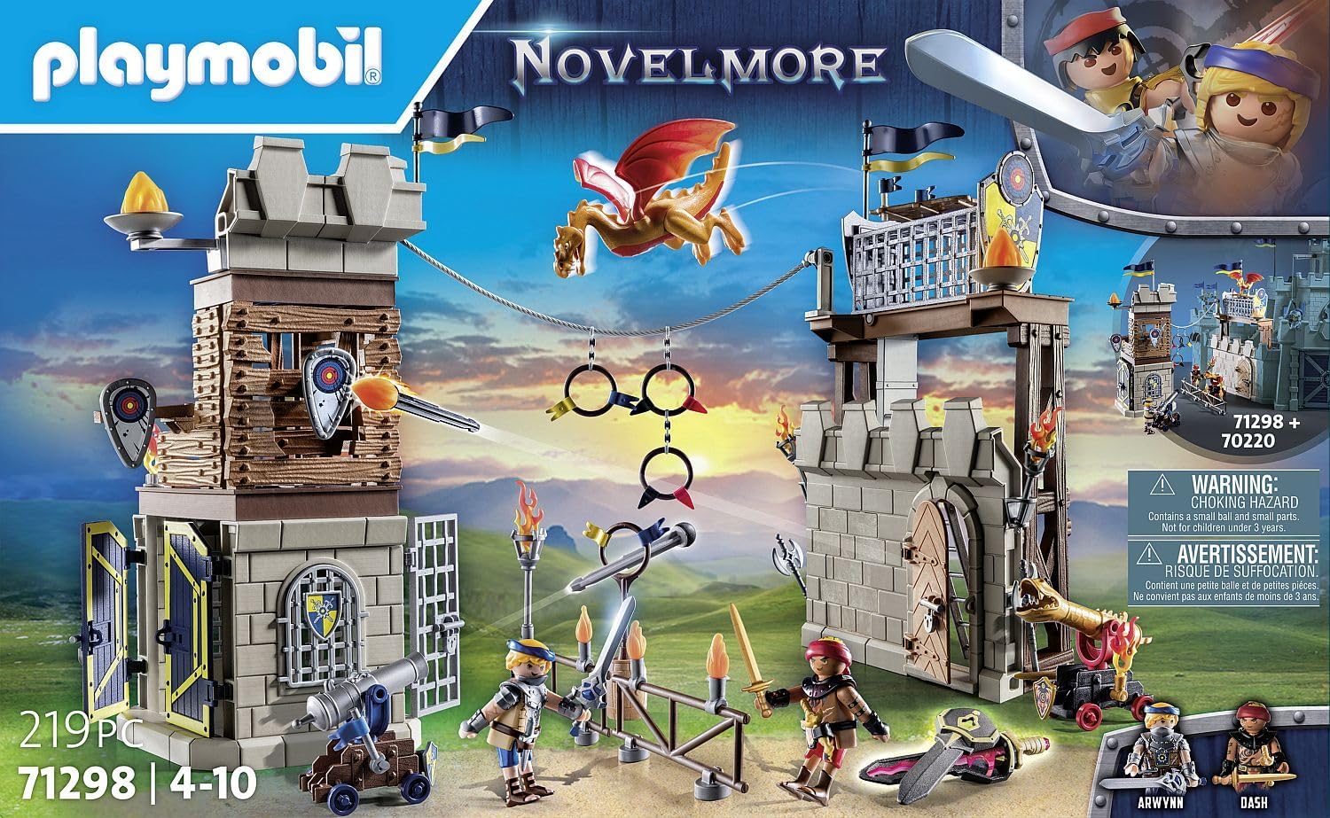 Turniej Rycerzy Novelmore to idealny zestaw dla wszystkich małych miłośników rycerzy. Zestaw o wymiarach oferuje wszystko, czego potrzeba do emocjonującego turnieju. Rycerze Novelmore i Jeźdźcy z Burnham walczą w różnych dyscyplinach o legendarny Miecz Strażnika. Arena turniejowa jest pełna ekscytujących funkcji i akcesoriów. Figurki PLAYMOBIL Arwynn i Dash toczą emocjonujący pojedynek, strzelając kulami armatnimi przez pierścienie tarcz, aby zdobywać punkty. Wieża ma wyłom i zapadnię, które można uruchomić, trafiając w cele. W dolnej części wieży znajduje się również więzienie oraz klatka, w której znajduje się miecz strażnika.