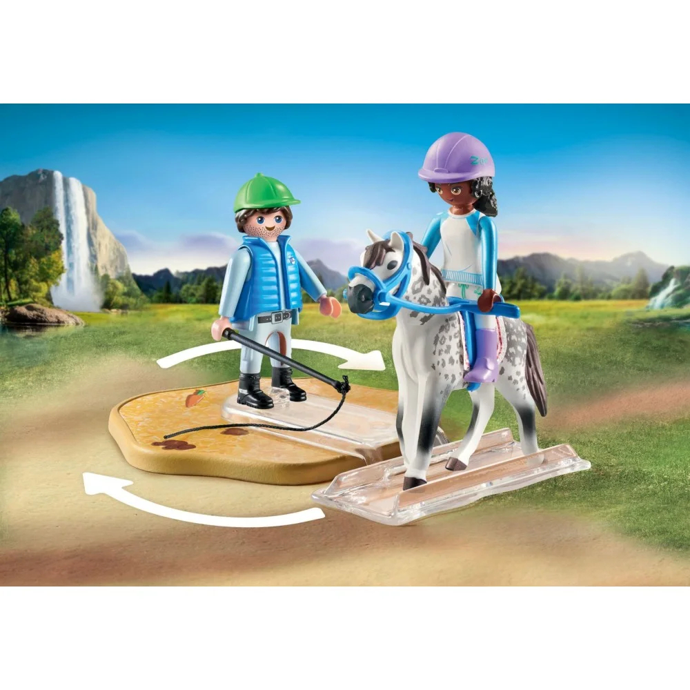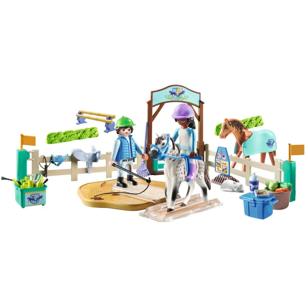 Przygotuj się na jeszcze więcej ciekawych przygód jeździeckich na Ranczu Waterfall z Nowoczesną areną jeździecką PLAYMOBIL! Na arenie jeździeckiej w Waterfall możesz nauczyć się wszystkiego o prawidłowej pielęgnacji koni oraz różnych technikach jazdy! Instruktor jazdy konnej Owen znajduje się na płycie z lonżownikiem, a koń na przezroczystej szynie, aby odbyć prawdziwy trening! Zoe dowiaduje się, że lonżowanie sprzyja koncentracji konia i wzmacnia więź między nim a jeźdźcem. Do ćwiczeń wykorzystywana może być drewniana figurka konia, a dzięki bogatemu wyposażeniu można nauczyć się różnych technik jeździeckich. Koń Zoe - Blaze również musi być odpowiednio pielęgnowany i karmiony. Lekcje na arenie jeździeckiej Waterfall nigdy nie są nudne!