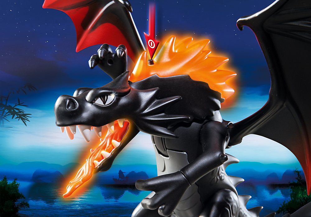 Po naciśnięciu guzika ognista grzywa i język Olbrzyma zaczynają się świecić. Smok ma ruchome skrzydła i łapy.