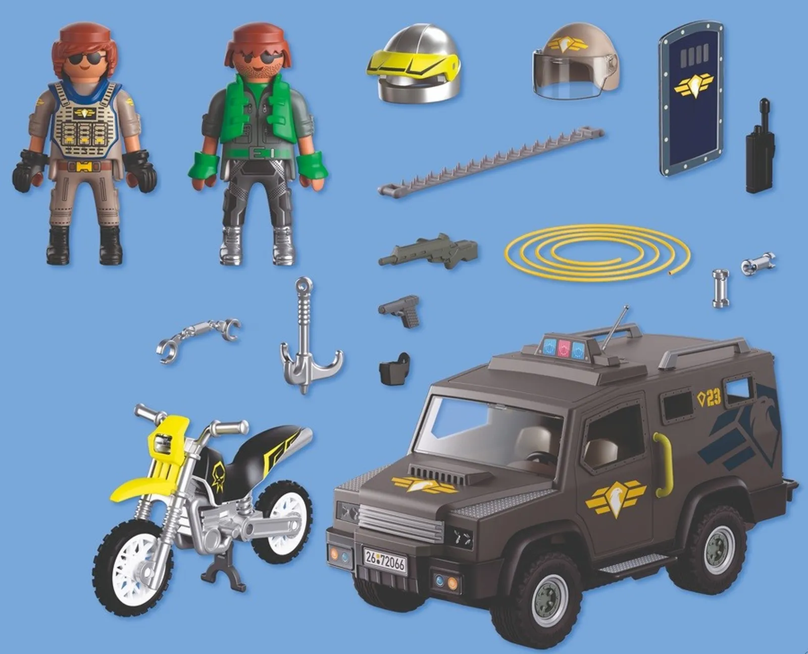 Opancerzony pojazd SWAT natychmiast rusza na miejsce przestępstwa – jednostka specjalna jest gotowa do interwencji! Oficer SWAT chwyta za tarczę, broń jest również gotowa do użycia jako środek odstraszający – ponieważ zbiegły przestępca pędzi już na pełnym gazie swoim motocyklem. Używając haków próbuje uciec ze skradzionym łupem przed policją. Ale policjanci mają w bagażniku tajną broń: kolczatkę drogową! Czy uda im się go powstrzymać? Rozpoczyna się emocjonująca zabawa w kotka i myszkę!