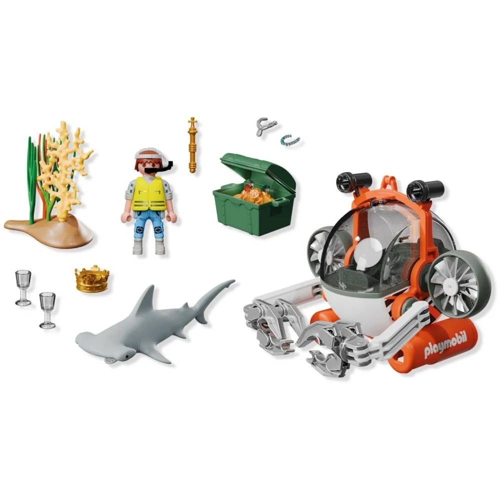 Wyrusz w morską przygodę z zestawem PLAYMOBIL! Wyposażona w ruchome ramiona i zdejmowaną kopułę łódź podwodna jest gotowa do wydobycia błyszczącego skarbu z dna oceanu. Czy kapitanowi uda się przechytrzyć rekina młota strzegącego cennego skarbu? Dzięki pomysłowym funkcjom pływalności łódź podwodna może unosić się na wodzie lub zanurzać, zupełnie jak w rzeczywistości! Bogaty w klejnoty, korale i tajemnicze relikwie, ten zestaw PLAYMOBIL sprawia, że każde zanurzenie staje się ekscytującym poszukiwaniem złota i chwały pod falami.