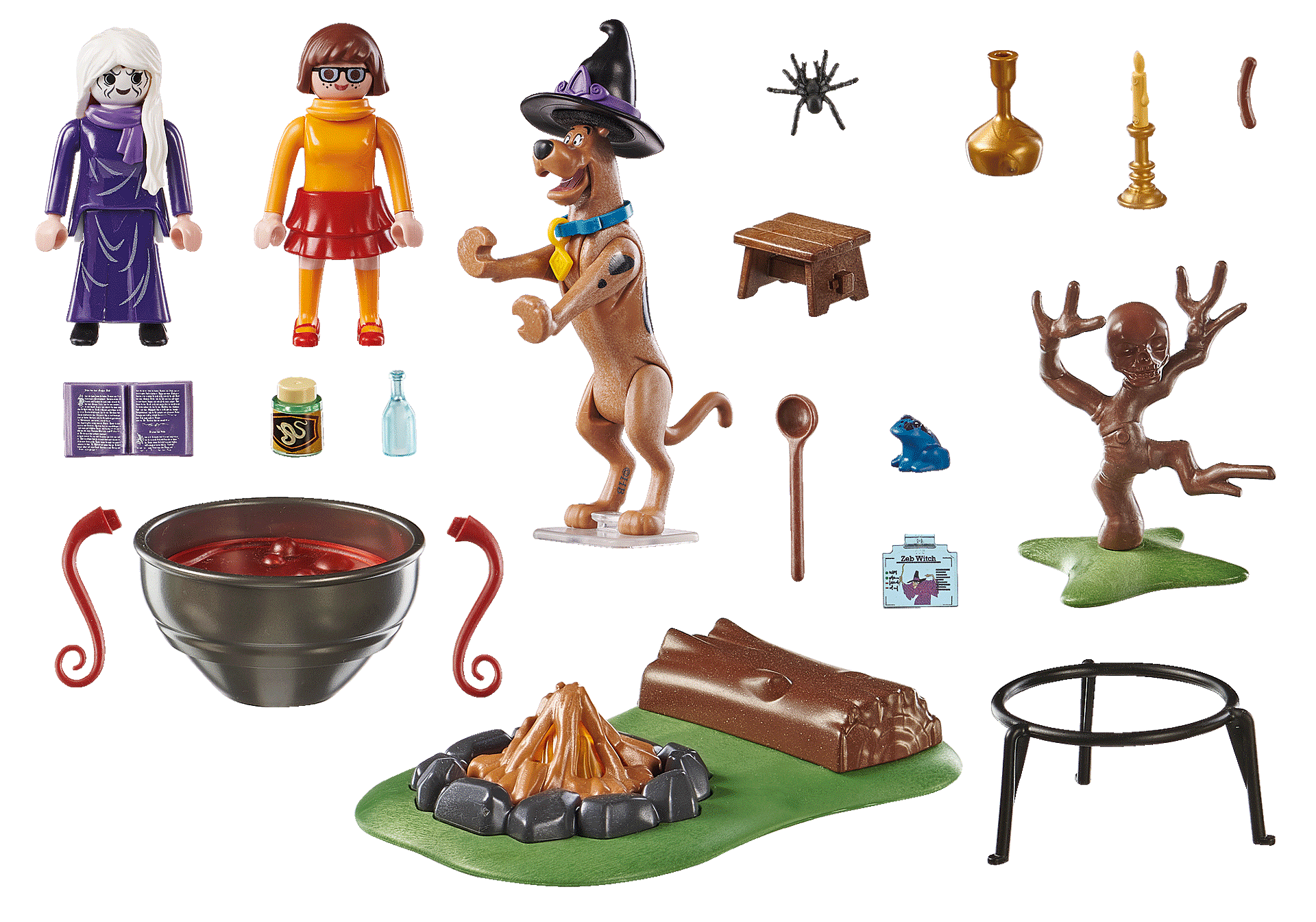 Przygoda w kotle czarownicy! Scooby-Doo z Velmą próbują uciec przed czarownicą rzucającą zaklęcia! Scooby-Doo ma nadzieję, że jego kapelusz czarownicy da mu moc uwolnienia siebie i Velmy od stania się częścią naparu wiedźmy! Odkryj prawdziwą tożsamość Zeb Witch, obracając jej twarz. Zbierz kartę ducha Zeb Witch i oświetl ją w Mystery Mansion lub czytniku w Mystery Machine (70361 i 70286 - każdy sprzedawany oddzielnie).
