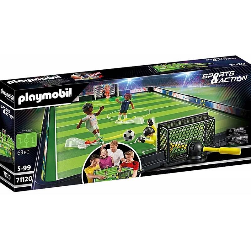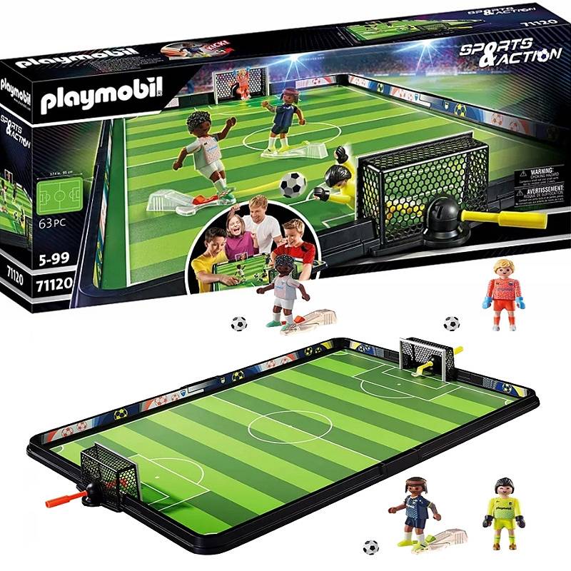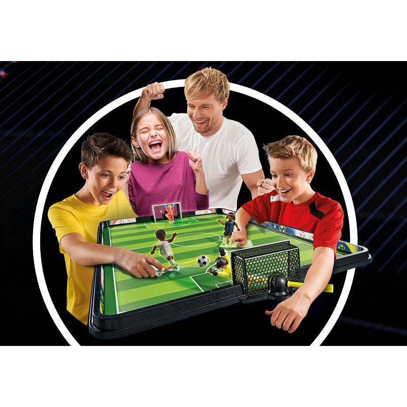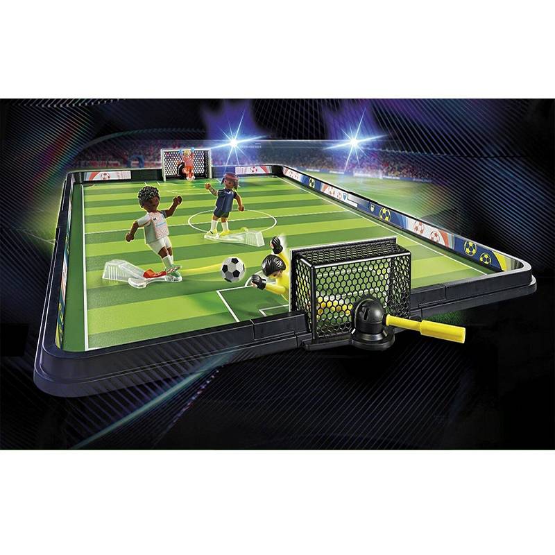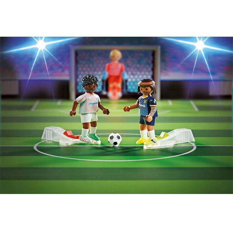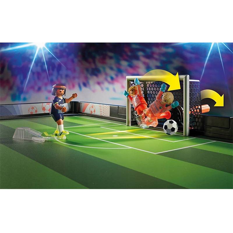 Strzał, gol i zwycięstwo! Poczuj futbolową gorączkę z areną piłkarską PLAYMOBIL. Wszyscy czekali na wielki turniej od miesięcy i nie mogą się doczekać jego rozpoczęcia. Po rozgrzewce gracze wychodzą na boisko i zaczyma sie wielka rywalizacja. Jak myślisz, która drużyna zdobędzie puchar? Dzięki praktycznej funkcji kopnięcia, płaskie i wysokie piłki mogą zostać oddawane. Nalep swoim piłkarzom ich indywidualne numery. Świetny zestaw do zabawy dla dzieci kochających sport.