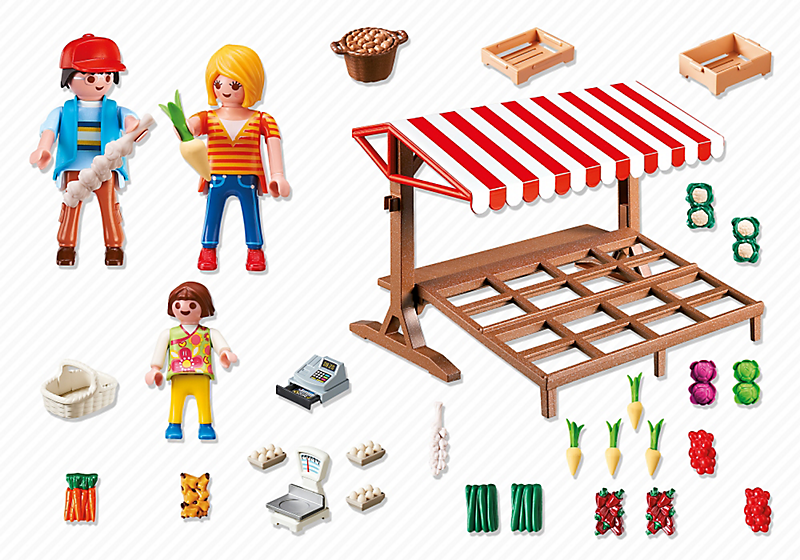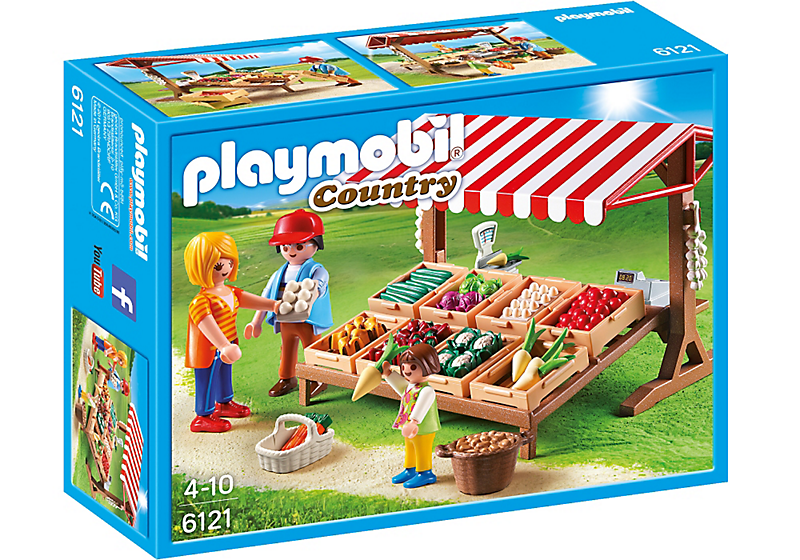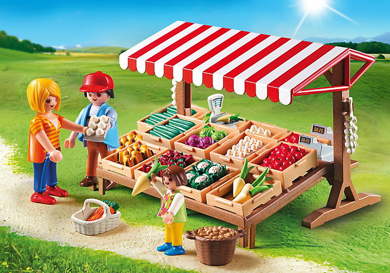 Seria Country to idealna propozycja dla wszystkich dzieci, które kochają zwierzęta. Pokaż dziecku jak wyglądają wakacje na wsi oraz jak dbać i opiekować się pupilami. Zestaw zawiera trzy figurki Playmobil, stragan,skrzynki, koszyk na zakupy, kasę, wagę, warzywa: kalafiory, pomidory, kapusty białą i czerwoną, marchewki, pietruszkę, ogórki, paprykę, kosz z ziemniakami, czosnek oraz jajka.