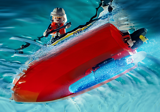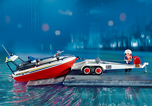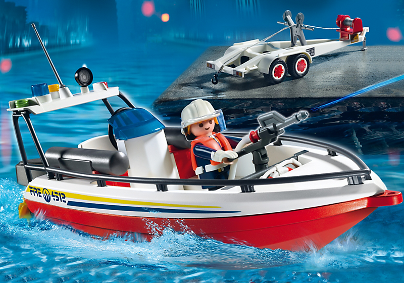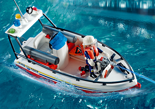 Łódź Motorowa z przyczepą Straży pożarnej Playmobil 4823 wkracza do akcji! Na pełnej prędkości strażak płynie swoją łodzią na miejsce zdarzenia. Pożar zostaje szybko ugaszony funkcjonalną gaśnicą! Z powrotem na ląd łódź można wyciągnąć wyciągiem linowym wprost na przyczepę. Teraz łódź motorowa straży pożarnej jest znów gotowa do wyruszenia na akcję – w każdym rejonie kraju!