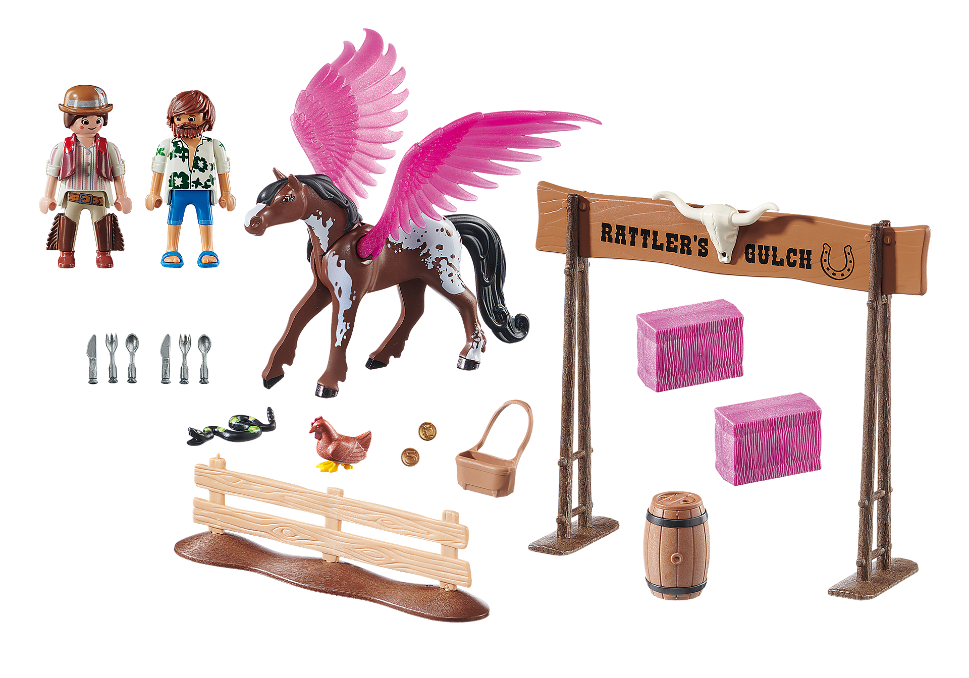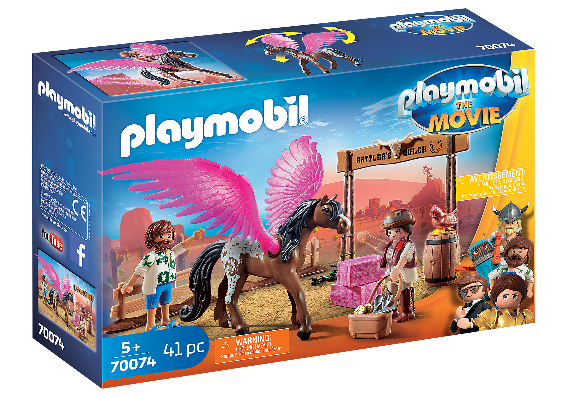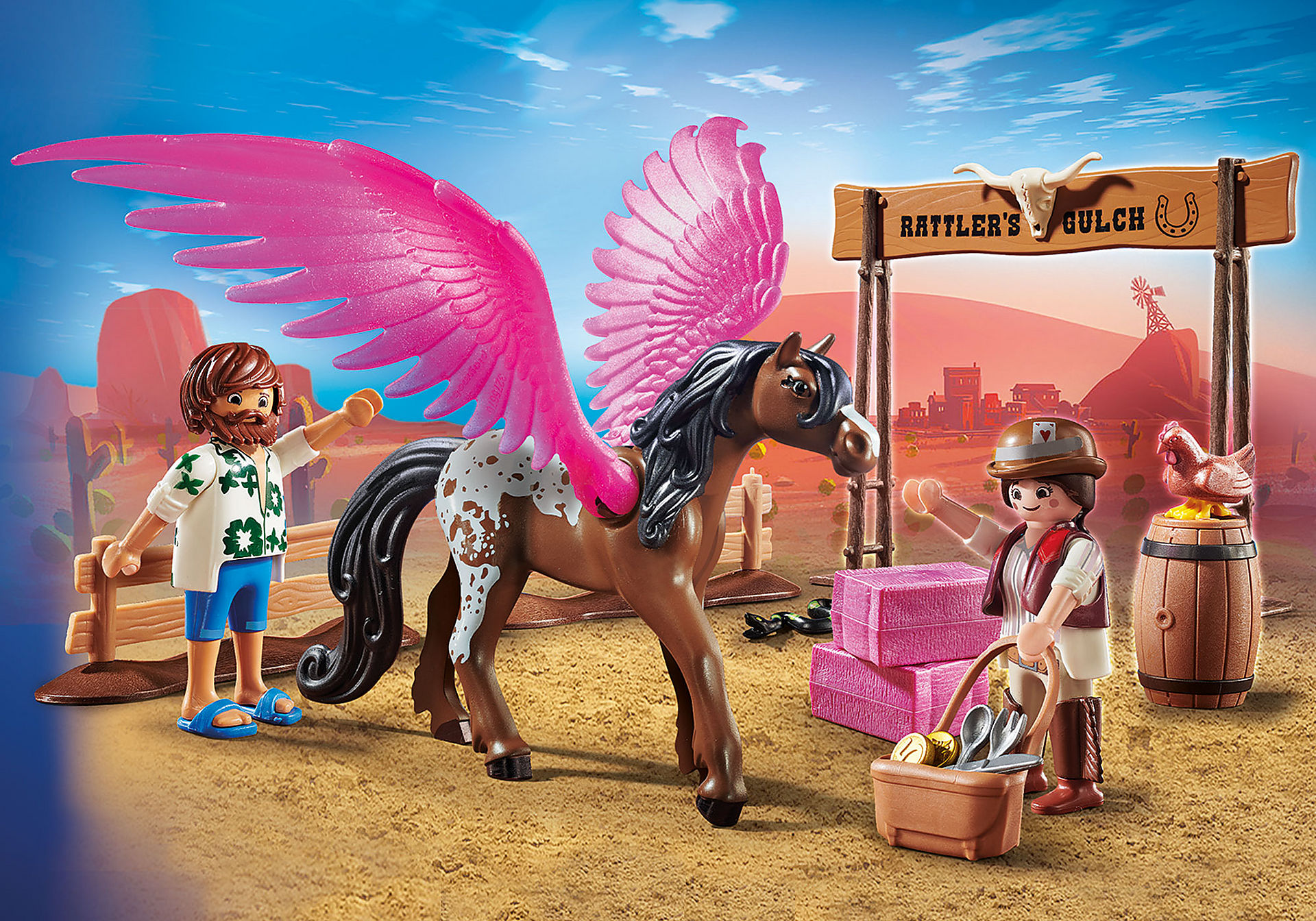 Playmobil The Movie Marla, Dell i Skrzydlaty Koń 70074 W skład zestawu wchodzi figurka Marli w stroju z Dzikiego Zachodu, głównej bohaterki z filmu Palymobil. Towarzyszy jej zwariowany Del oraz koń z różowymi skrzydłami. Figurki można posadzić na koniu. Zestaw uzupełnia zagroda, magiczne siano i inne akcesoria. Zestaw stanowi wspaniałe uzupełnienie serii Playmobil Film, ale świetnie nadaje się również do zabawy z pominięciem innych zestawów.