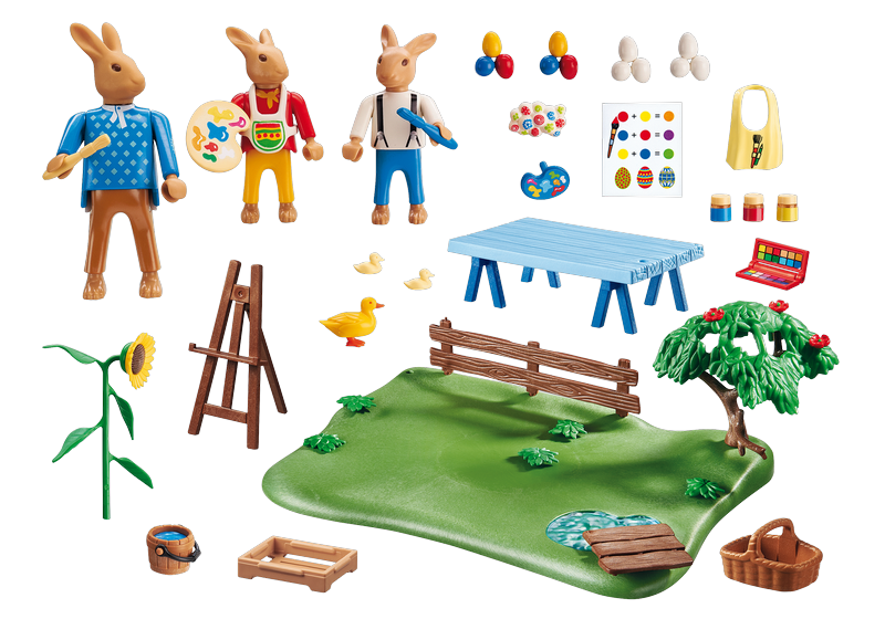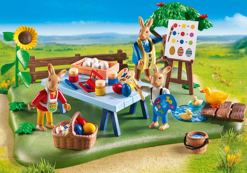 Święta Wielkanocne tuż, tuż… Playmobil warsztat zajączków to świetny pomysł na Wielkanocny prezent. Sprawdź jak najszybciej, co Wielkanocny Zajączek przygotował dla Ciebie na święta. Zestaw zawiera figurki zajączków, jajka do malowania, pisanki, akcesoria: ławka, elementy do malowania, słonecznik, kaczki i inne.