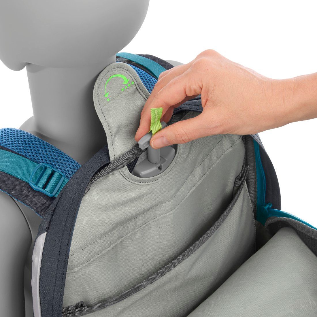 Nowy, łatwiejszy sposób na perfekcyjne dopasowanie plecaka do Twojego wzrostu. Skorzystaj z ukrytego wewnątrz pokrętła i dopasuj położenie szelek do długości pleców. Regulacja jest bezstopniowa, dzięki czemu plecak można dopasować indywidualnie do każdej osoby o wzroście od 135 cm aż do 180 cm – plecak rośnie z Tobą.