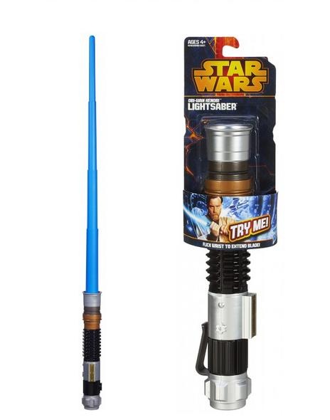 Dzięki podstawowej wersji miecza świetlnego Star Wars możesz wcielić się w postać Obi-Wan Kenobi i odegrać swoje ulubione sceny z Gwiezdnych Wojen. Miecz świetlny ma wysuwane teleskopowo ostrze (nieświecące) oraz uchwyt zaprojektowany tak by świetnie trzymał się w ręce i ułatwiał walkę. Dzięki specjalnemu zaczepowi, umieszczonemu na uchwycie, mały wojownik po skończonej walce, może przypiąć swój miecz do paska od spodni.