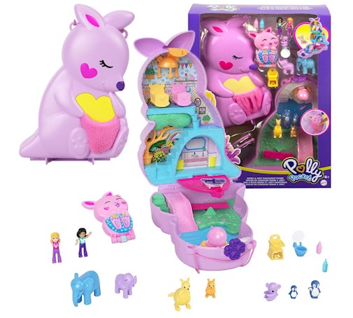Kompaktowy Zestaw torebka Kangurki Polly Pocket po otwarciu odsłania malutki świat pełen wielkich przygód. Jego wygląd jest inspirowany kangurzycą o słodkim wyglądzie i z miękką torbą, w której chowa się mniejszy kangurek z niespodzianką. Otwórz kangurzycę, aby odsłonić wypełniony przygodami zestaw ze zwierzęcym żłobkiem, w którym są 2 mikrolalki, 7 zwierzątek, akcesoria i elementy do dynamicznej zabawy przez cały dzień!