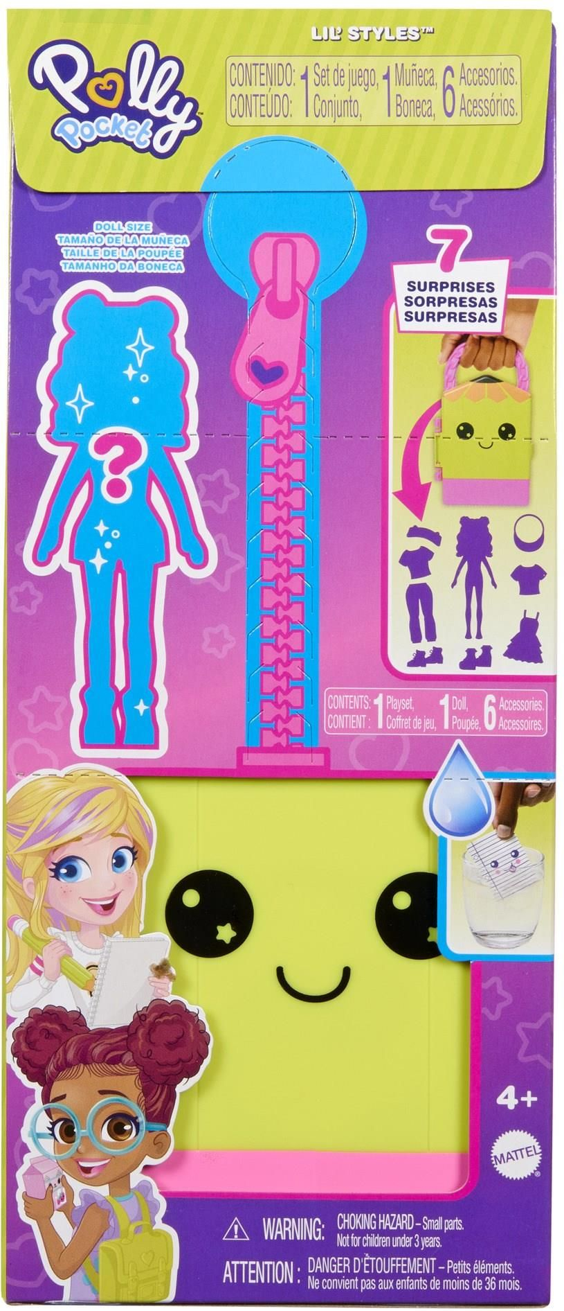 Polly Pocket redefiniuje styl i niespodziankę, wprowadzając zupełnie nowy poziom emocji do kolekcji skrzynek Lil' Styles. Rozpocznij przygodę z wyjątkowym zestawem do zabawy. Każda walizka tematyczna zawiera lalkę, 6 akcesoriów niespodzianek i torebkę, która rozpuszcza się w wodzie! Zabierz walizeczkę ze sobą, aby dobrze się bawić w dowolnym miejscu!