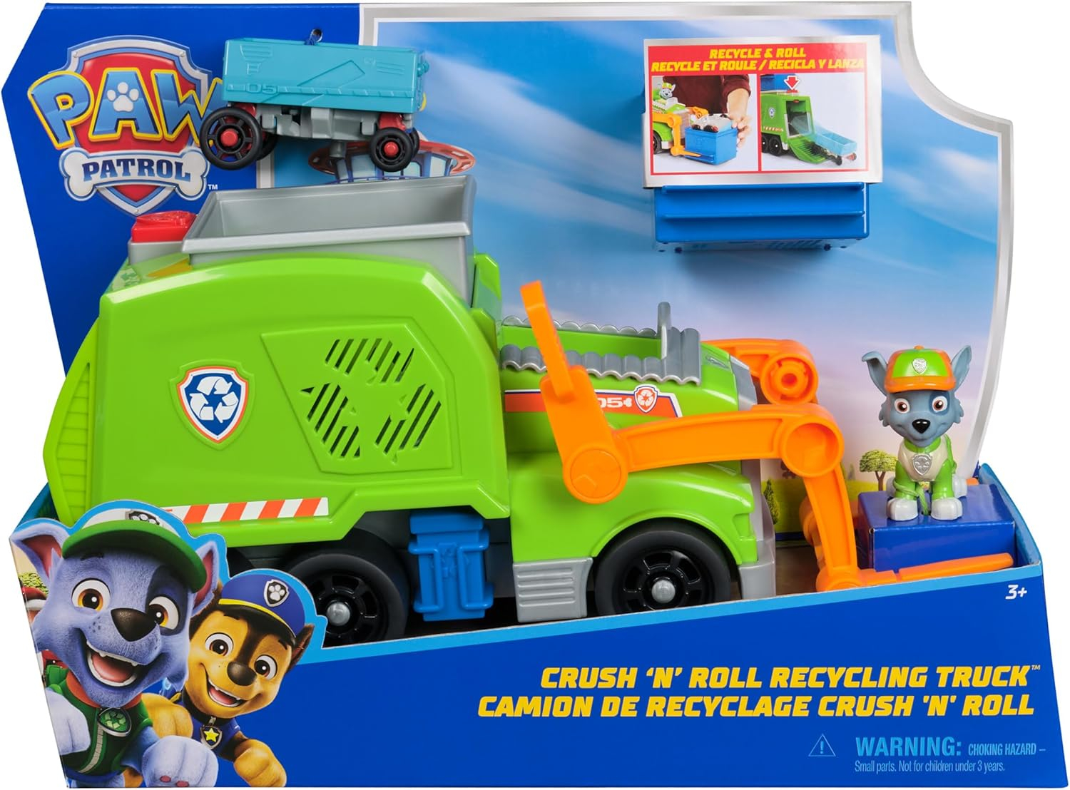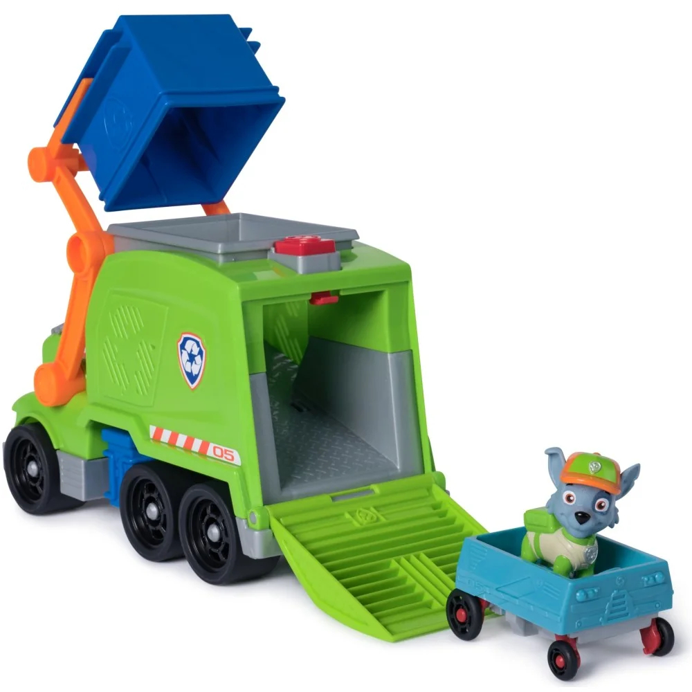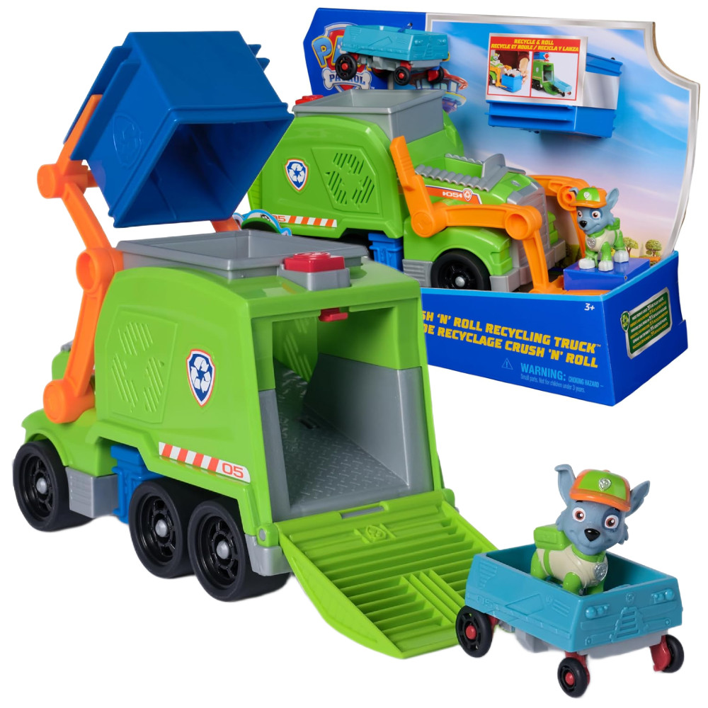 Ratuj sytuację dzięki Rocky'emu i jego śmieciarce! Posadź Rocky'ego na fotelu kierowcy przed wyruszeniem na misję! Załaduj zgnieciony pojazd do pojemnika, a następnie wsuń pojemnik na zabawkowy wózek widłowy i pociągnij dźwignię wózka, aby załadować zgnieciony pojazd do recyklera. Naciśnij przycisk na zabawce śmieciarki, aby opuścić rampę i przekształcić zgnieciony pojazd w mini zabawkę, którą Rocky może jeździć!