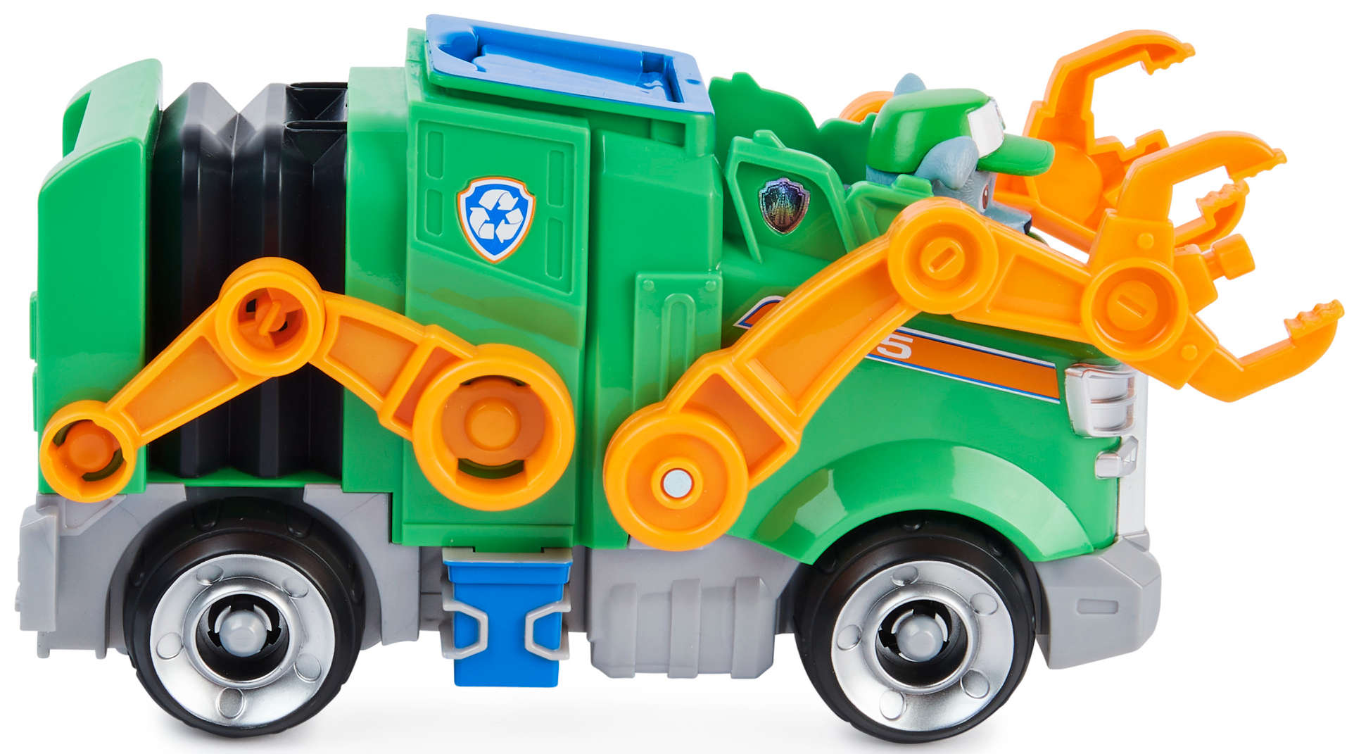 Wrzuć dołączoną kostkę do ciężarówki Rocky'ego i opuść ramiona, aby aktywować wyjątkową transformację pojazdu. Zagęszczarka przetwarza kostkę i wyrzuca ją z tyłu, aby użyć jej jako pocisku! Resetuj, przetwarzaj i przekształcaj raz za razem!
