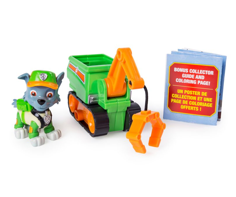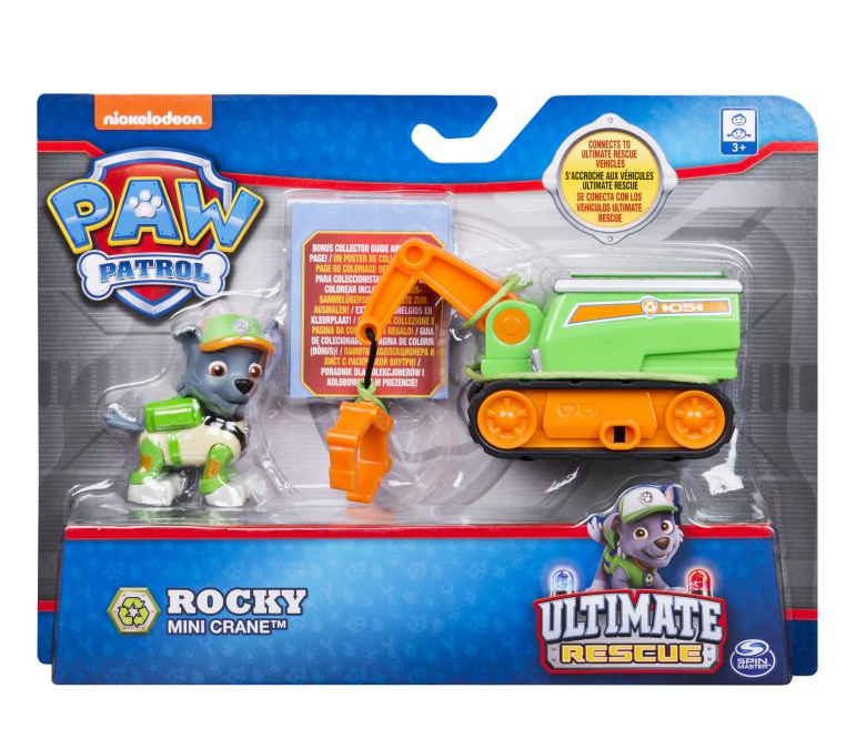 Zestaw składa się z mini pojazdu - śmieciarki oraz figurki pieska Rubble. Pojazd wyposażony jest w ruchome ramię śmieciarki, a w jego środku znajdziemy miejsce na figurkę pieska. Dzięki bocznemu zaczepowi, pojazd łączy się z pojazdami Ultimate Rescue. Figurka Rocky'ego ma ruchome łapki i ubrana jest w zielony kubraczek oraz pomarańczowo - zieloną czapkę z daszkiem. Zbierz całą kolekcję i odtwarzaj sceny ze swojego ulubionego filmu.