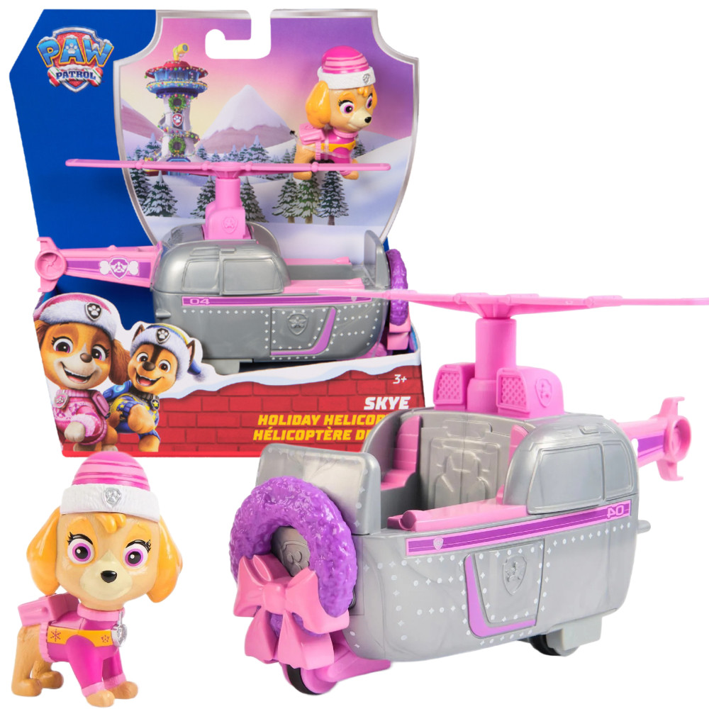 Wyrusz na ratunek z drużyną przesympatycznych szczeniaków. Zestaw zawiera wyjątkowy świąteczny pojazd helikopter z ruchomym śmigłem oraz kołami, a także figurkę Skye. Piesek ubrany jest w świąteczny różowy kubraczek z plecaczkiem oraz świąteczną czapeczkę. Zestaw z całą pewnością spodoba się każdemu miłośnikowi perypetii grupy bohaterskich szczeniaków z serii Psi Patrol.
