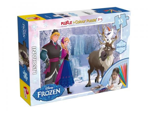 Puzzle firmy Lisciani są dwustronne. Oznacza to, że z jednej strony dziecko układa obrazek jak w tradycyjnych puzzlach, z drugiej zaś powstaje taki sam obrazek, który jest czarno białym szablonem i służy dziecku jako kolorowanka. Puzzle dwustronne z wizerunkami bohaterów bajki Frozen.