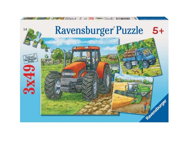 Puzzle Ravensburger Maszyny na Farmie 3x49 elementów pozwalają na ułożenie aż trzech różnych obrazków! Jest to gratka zwłaszcza dla wielbicieli różnego rodzaju maszyn rolniczych. Dzięki puzzlom Maszyny na Farmie możemy utworzyć obrazki prezentujące traktor z pługiem orający pole, kombajn podczas koszenia zboża oraz ciężarówkę wiozącą na pace ścięte drzewa z lasu. Wystarczy połączyć 49 elementów układanki i gotowe!
