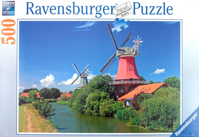 Puzzle Ravensburger Wiatraki 500 elementów pozwalają na ułożenie obrazka przedstawiającego holenderskie wiatraki. Przepiękny krajobraz z rzeką i stojącymi przy jej brzegu młynami to gwarancja dobrej zabawy podczas łączenia wszystkich 500 elementów w jedną całość. Gdy już połączysz wszystkie puzzle Wiatraki wystarczy włożyć je do antyramy i już mamy gotową elegancką dekorację gotową do powieszenie na ścianie Twojego pokoju.