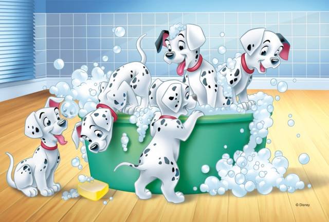 Puzzle Trefl 101 Dalmatyńczyków 60 elementów przedstawiają gromadkę wesołych szczeniaczków. Młode Dalmatyńczyki bardzo chcą zażyć kąpieli w pianie jednak miska, w której próbują to zrobić okazuje się być za mała dla wszystkich. Układając puzzle Trefl 101 Dalmatyńczyków dowiesz się jak skończyły się figle tych małych, sympatycznych piesków.