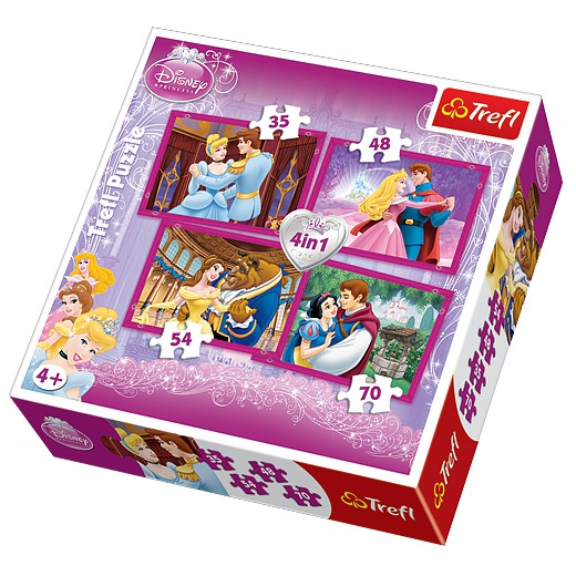 Puzzle Trefl Zakochane Pary 4w1 to aż cztery układanki zamknięte w jednym pudełku. Dzięki temu możliwe jest ułożenie kilku obrazków przedstawiających piękne Księżniczki Disneya - Kopciuszka, Belle, Aurore i Śnieżkę tańczącymi z książętami. Taki zestaw to ciekawe rozwiązanie dla rodzeństwa, ponieważ każdy może ułożyć swój obrazek i to w tym samym czasie. Dodatkowo zróżnicowana wielkość elementów umożliwia zabawę zarówno młodszym oraz nieco starszym dzieciom.