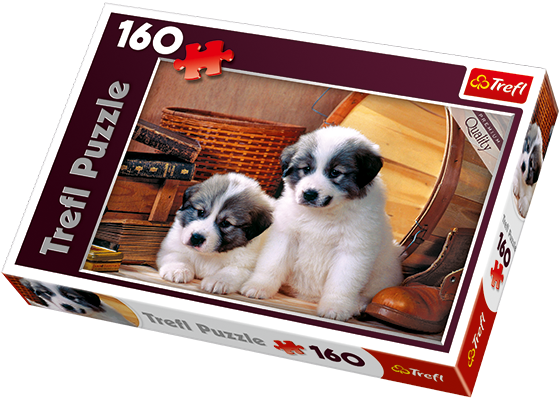 Puzzle 160 elementów ze zdjęciem słodkich szczeniaków. Po ułożeniu powstanie obrazek o wymiarach 41 x 27,8 cm. Wysoką jakość, nasycenie kolorów i bezpieczeństwo układania zapewnia kalandrowany papier odbijający światło, pokryty ekologicznymi farbami spożywczymi.