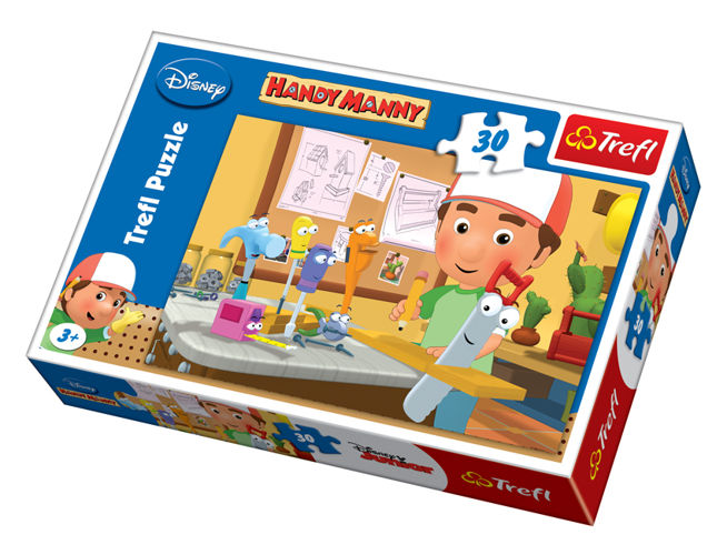 Puzzle Trefl Handy Manny w warsztacie 30 elementów pozwalają na ułożenie prostokątnego obrazka przedstawiającego głównego bohatera bajki Maniek Złota Rączka. Maniek jest w warsztacie przy stole w otoczeniu swoich ulubionych narzędzi gotowy by zająć się kolejnymi wielkimi remontami i naprawami. Dla dzielnego Mańka Złotej Rączki nie ma zadanie nie do wykonania!