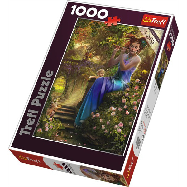 Puzzle 1000 elementów z motywem flecistki w magicznym ogrodzie. Po ułożeniu powstanie obrazek o wymiarach 48 x 68 cm. Wysoką jakość, nasycenie kolorów i bezpieczeństwo układania zapewnia kalandrowany papier odbijający światło i wykorzystanie materiałów ekologicznych.