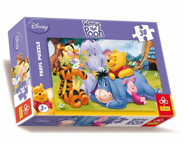 Puzzle Trefl Kubuś Puchatek 30 elementów to sympatyczna układanka przedstawiająca bohaterów popularnej bajki Disneya. Kubuś Puchatek, Tygrysek, Prosiaczek i Kłapołuchy razem z młodym hefalumpkiem zbierają kwiatki w ogrodzie Pana Królika. Czas na sielankową przygodę z przyjaciółmi ze Stumilowego Lasu!