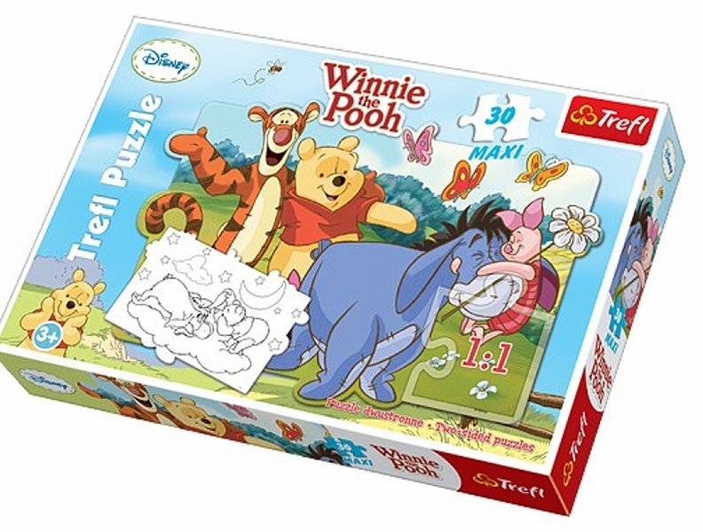 Puzzle Trefl Maxi Kubuś Puchatek 30 elementów umożliwiają ułożenie obrazka przedstawiającego czterech bohaterów bajki o niesfornym misiu. Po ułożeniu wszystkich 30 elementów dzieci mogą kontynuować zabawę układając drugą stronę obrazka by móc ją następnie pokolorować! W trakcie zabawy dzieci dodatkowo rozwijają zdolności manualne, spostrzegawczość oraz umiejętność samodzielnego tworzenia. Dodatkowo piękna grafika w stylu Disneya sprawi radość miłośnikom Kubusia Puchatka i jego Przyjaciół.
