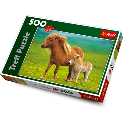 Puzzle Trefl Kucyki na Łące 500 elementów pozwalają na ułożenie obrazka przedstawiającego dwa kucyki pasące się na łące. Mama kucyk z młodym pięknie prezentują się na tle zielonej łąki pokrytej żółtymi mleczami. Ta logiczna układanka, gdzie składowe elementy pasują do siebie w jeden niepowtarzalny sposób, rozwija wyobraźnię i logiczne myślenie.
