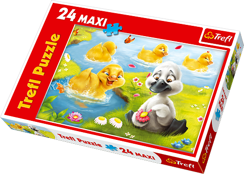 Puzzle Trefl Maxi Brzydkie Kaczątko 24 elementów pozwalają na ułożenie obrazka przedstawiającego brzydkie kaczątko razem ze swoim przybranym rodzeństwem. Szare kaczątko jest bardzo smutne ponieważ nie jest tak ładne jak pozostałe kaczuszki. Nasz bohater nawet się nie domyśla jak skończy się cała historia.