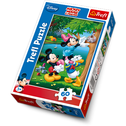Puzzle Trefl Mickey Mouse Piknik 60 elementów umożliwiają ułożenie obrazka przedstawiającego trzech najbardziej rozpoznawalnych bohaterów Disneya. Cała trójka wybrała się na piknik do lasu. Na miejscu wypatrzyli małego kotka, który utknął na drzewie. Myszka Miki i Kaczor Donald podnoszą Myszkę Mini by mogła uratować wystraszonego futrzaka. Ułóż wszystkie 60 elementów tej układanki i przekonaj się na własne oczy jak wygląda ta scena.