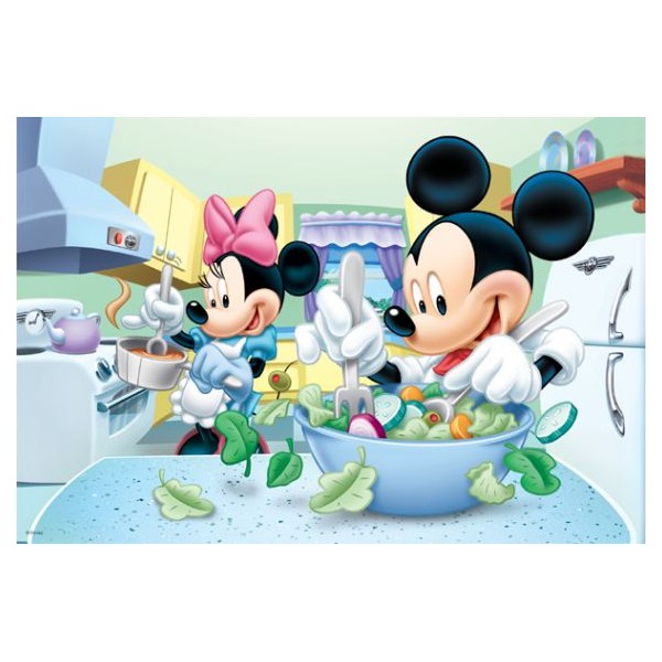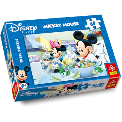 Puzzle Trefl Mickey Mouse Sałatka 60 elementów pozwala ułożyć obrazek z dwiema najsłynniejszymi myszami na Świecie. Myszki Miki i Mini są razem w kuchni i przygotowują przepyszną sałatkę oraz ciasto. Ułóż puzzle Trefl Mickey Mouse i przekonaj się na własne oczy jak wyglądała ta scena.