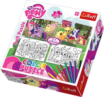 Color Puzzle to zestaw dwóch układanek, z których po ułożeniu powstają aż cztery wyjątkowe obrazki z uwielbianymi przez dziewczynki kucykami z bajki "My little pony". Wyjątkowość tych puzzli kryje się w możliwości ułożenia gotowych, kolorowych obrazków lub wykreowania własnych, które dziecko samodzielnie pokoloruje dołączonymi do zestawu flamastrami. Wystarczy ułożyć elementy stroną z konturowymi postaciami na białym tle do góry i pokolorować w dowolny sposób, ciesząc się kreatywną zabawą i samodzielnie stworzonym obrazkiem. Piękna grafika gwarantuje przyjemność tworzenia, a zabawa ćwiczy cierpliwość i pobudza wyobraźnię dziecka.