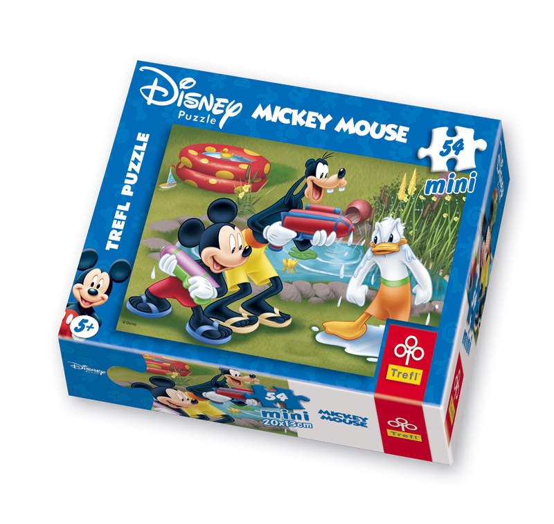 Puzzle Myszka Mickey Mini to wspaniała układanka zamknięta w małym, wygodnym opakowaniu. Dzięki temu z łatwością mieszczą się w dziecięcym plecaku lub na półce z zabawkami. Po ułożeniu wszystkich 54 elementów powstanie obrazek przedstawiający Goofiego i Myszkę Mickey polewających wodą z pistoletu wściekłego Kaczora Donalda. Do tego bajkowa grafika puzzli czyni je prawdziwą gratką dla prawdziwych fanów Disneya.