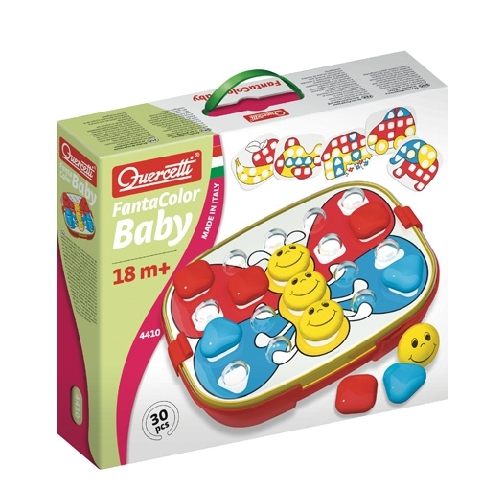 Quercetti Fantacolor Baby to walizeczka z tablicą, ogromnymi kołeczkami oraz kartami do odwzorowania obrazków. Kołeczki są na tyle duże by początkujący budowniczowie mogli z łatwością chwycić je do rączki. Karty z przykładami wkłada się pod tablicę i stąd nawet najmłodsze dzieci nie będą miały problemów z nauką odwzorowania. Po zabawie wszystkie elementy można szybko schować do zamykanej walizeczki. Zabawka ta wspaniale rozwija koordynację ręka-oko, precyzyjne umiejętności motoryczne oraz skłania do twórczego myślenia i kreatywności.