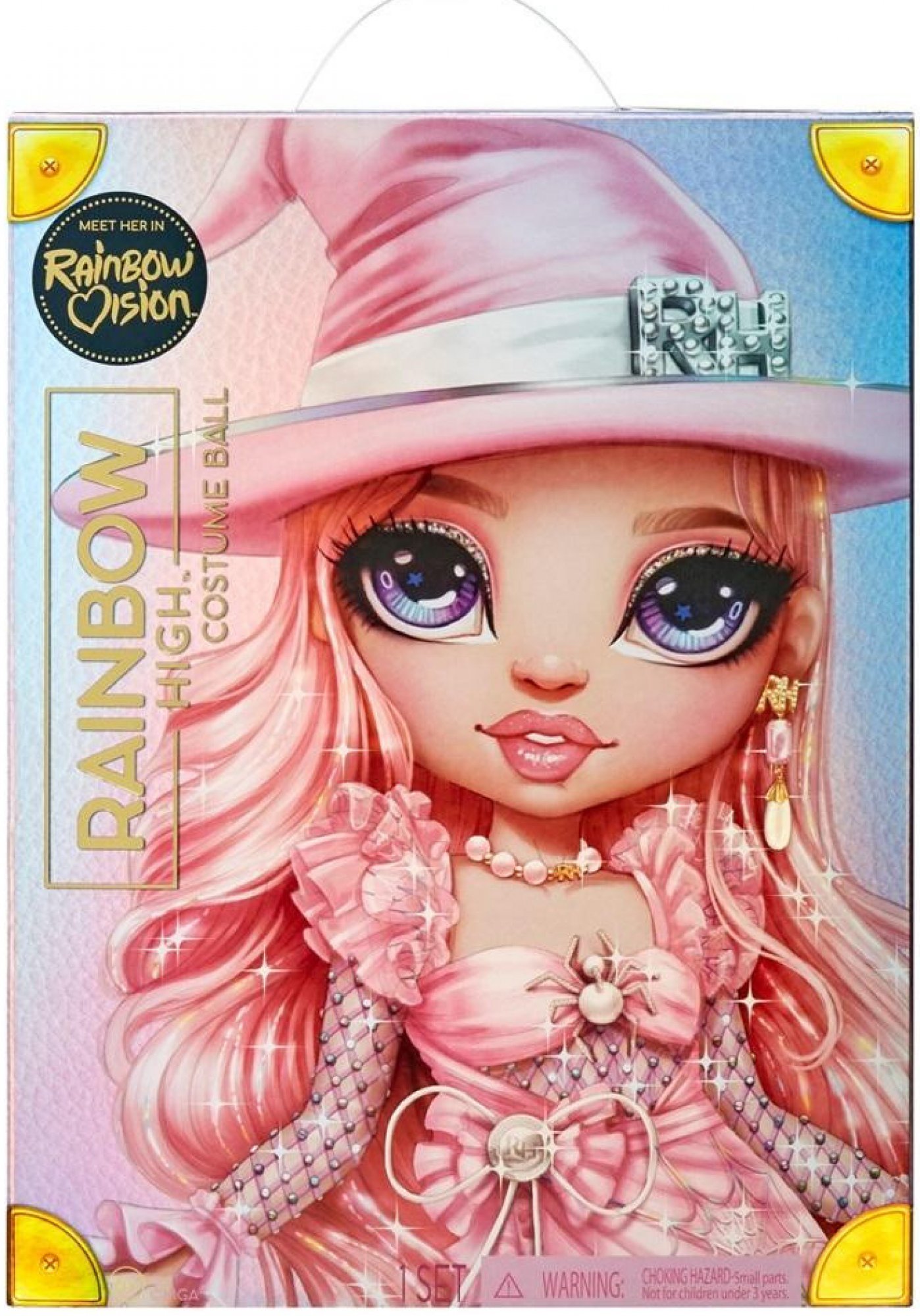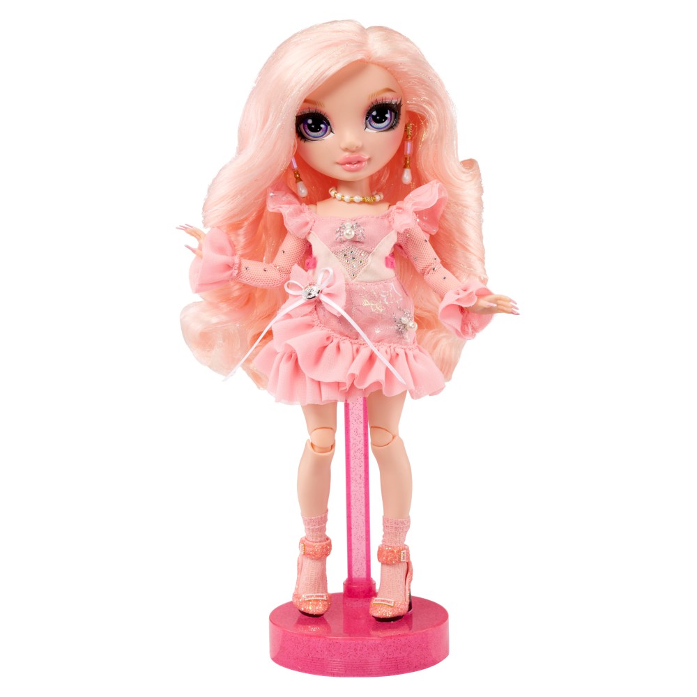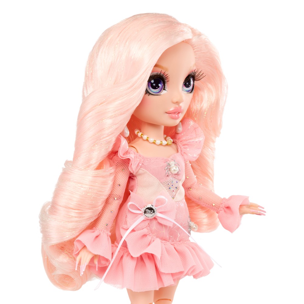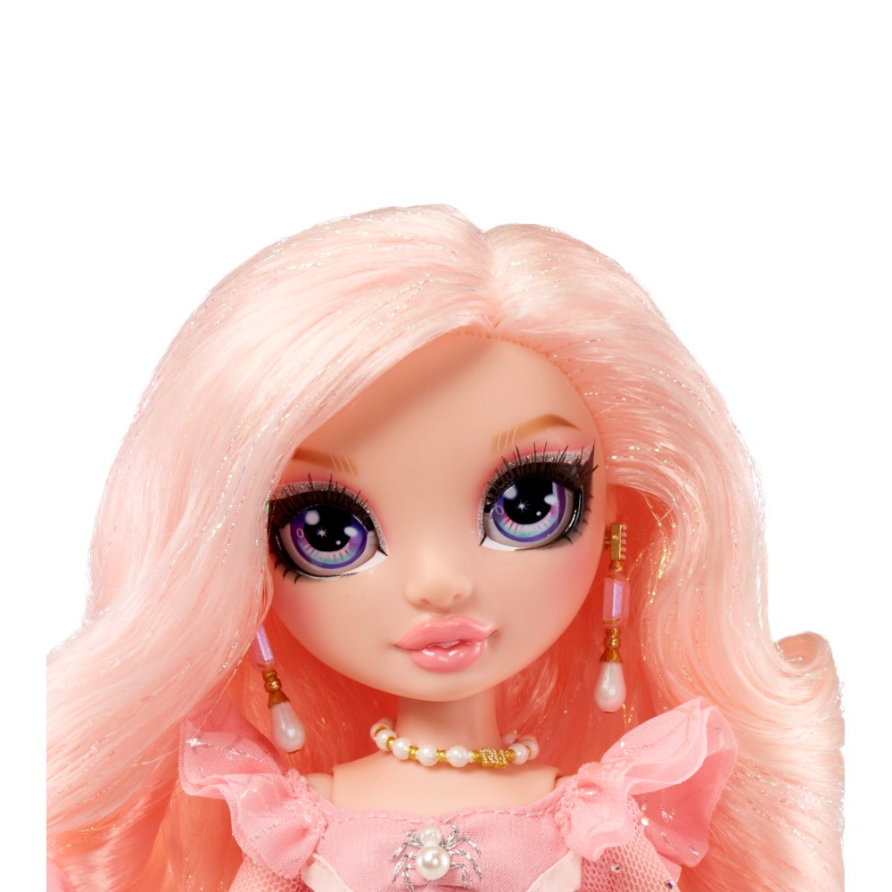 Modna lalka Bella ma na sobie krótką różową sukienkę z falbankami i błyszczącymi cekinami. Jasnoróżowe włosy zakręciła w stylowe loki, a na głowę nałożyła kapelusz wiedźmy z dużą srebrną sprzączką i opalizującym rantem. Różowe szpilki sparowała z koronkowymi skarpetkami. Czarująca!
