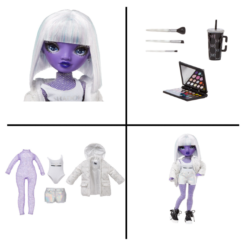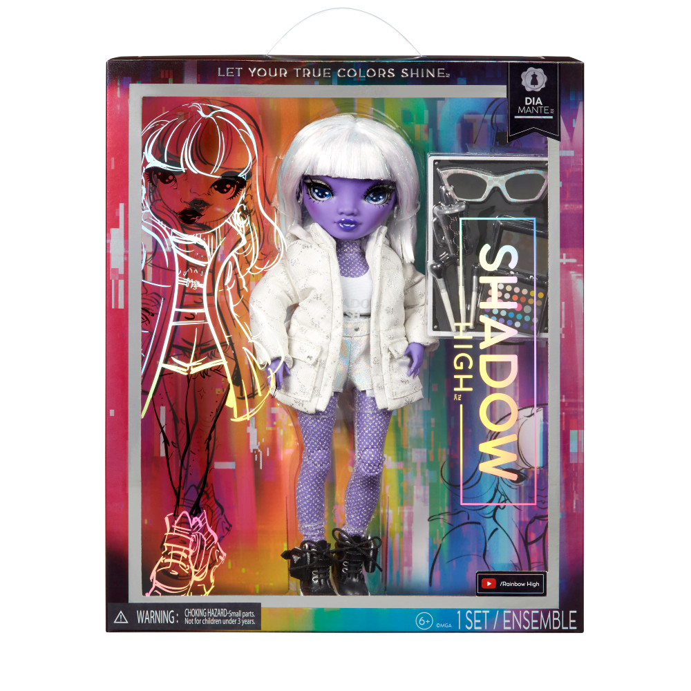 W Shadow High wszyscy uczniowie są kreatywni.Dia Mante jest jak błyszczący diamencik. Swój styl wyraża za pomocą połyskliwych materiałów i odważnych dodatków. Jest mistrzynią w łączeniu kolorów. Spójrzcie na nią! Klasyczną biel ożywiła ekstrawaganckim fioletem i uzyskała elektryzujący efekt! Modna lalka Dia Mante ma fioletową skórę i lśniące srebrno-białe włosy z grzywką. Niebieskie oczy podkreśliła wyrazistą czarną kreską zrobioną eyelinerem i rozświetlającym srebrnym cieniem do powiek. Na usta nałożyła ciemną, fioletową pomadkę z połyskiem.