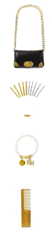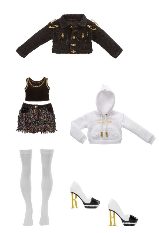 W zestawie znajduje się komplet modnych ubranek, w którego skład wchodzą: kolorowa spódnica, ciemny top, biała bluza z kapturem, ciemna kurteczka jeansowa, białe zakolanówki oraz czarno-białe szpilki. W zestawie znajdują się również dodatki takie jak: kolczyki, bransoletka, pasek w kształcie łańcuszka, torebka, grzebień oraz spinki do włosów. Nie zabraknie tutaj także dodatków dla modnej dziewczynki. W zestawie znajdują się dwie bransoletki oraz pierścionek.