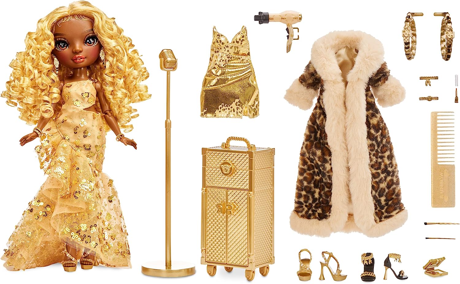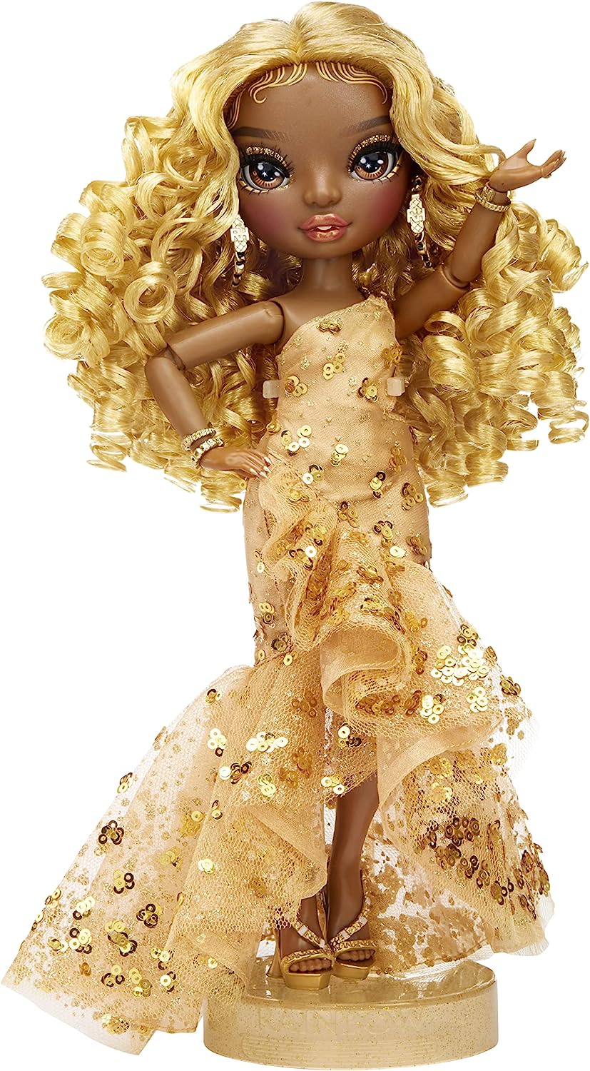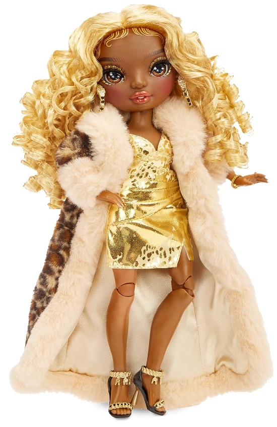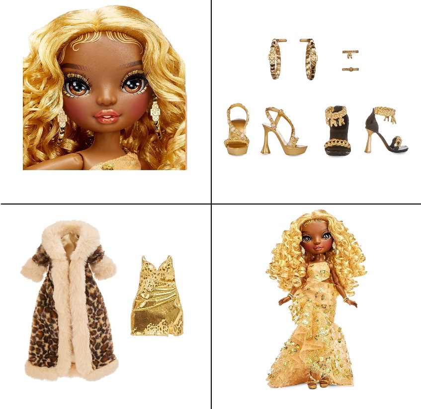 W zestawie znajdują się 2 niezwykłe komplety ubranek. Pierwszy zestaw składa się z eleganckiej złotej sukienki z cekinami. Całość stylizacji uzupełniają złote sandałki na wysokim obcasie. Drugi zestaw składa się ze złotej mini sukienki oraz efektownego płaszczyka w cętki. Całość stylizacji uzupełniają czarne sandałki na obcasie ze złotymi dodatkami. Tak duży wybór rzeczy pozwoli ci dowolnie tworzyć stylizację. Dodatkowo w zestawie znajduje się grzebień oraz dodatki, aby fryzura Meline zawsze była wyjątkowa.